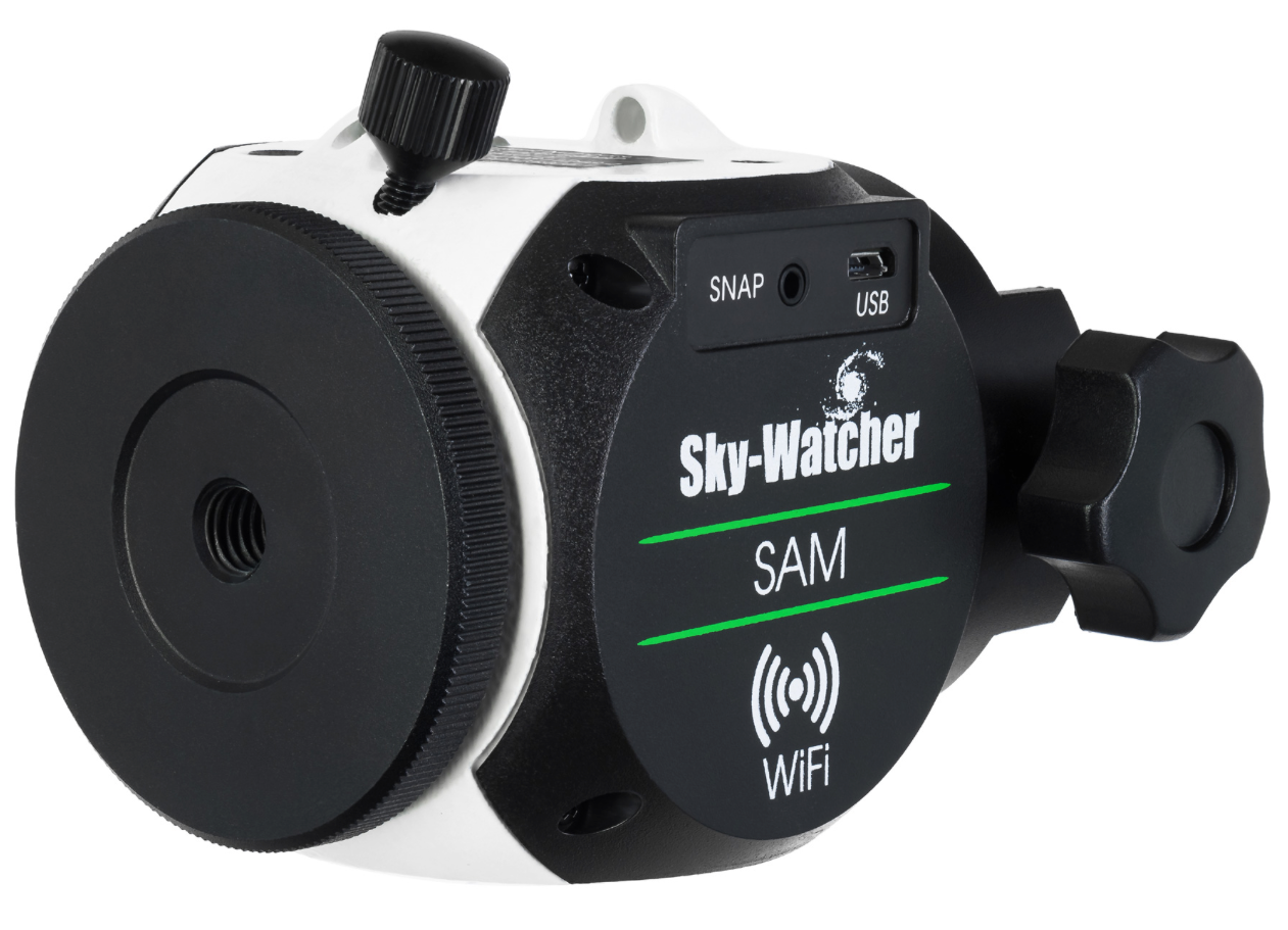 Sky-Watcher Star Adventurer Mini New оснащена встроенным модулем Wi-Fi, за счет чего к ней можно подключиться со смартфона/планшета на базе iOS или Android для управления системой. Перед началом работы на мобильное устройство потребуется установить бесплатное фирменное приложение Star Adventurer Console. Возможности ПО широки: оно предлагает наборы настроек для разных вариантов съемки (обычная астрофотография, замедленная астросъемка, съемка на обычной выдержке, съемка на длинной выдержке), доступ к ручному управлению монтировкой и специальную утилиту для выравнивания инструмента по полярной оси. Для грубой или точной настройки по полярной оси потребуется использовать искатель полюса и подсветку искателя (входят в комплект); также рекомендуется применение экваториального клина (не входит в комплект).