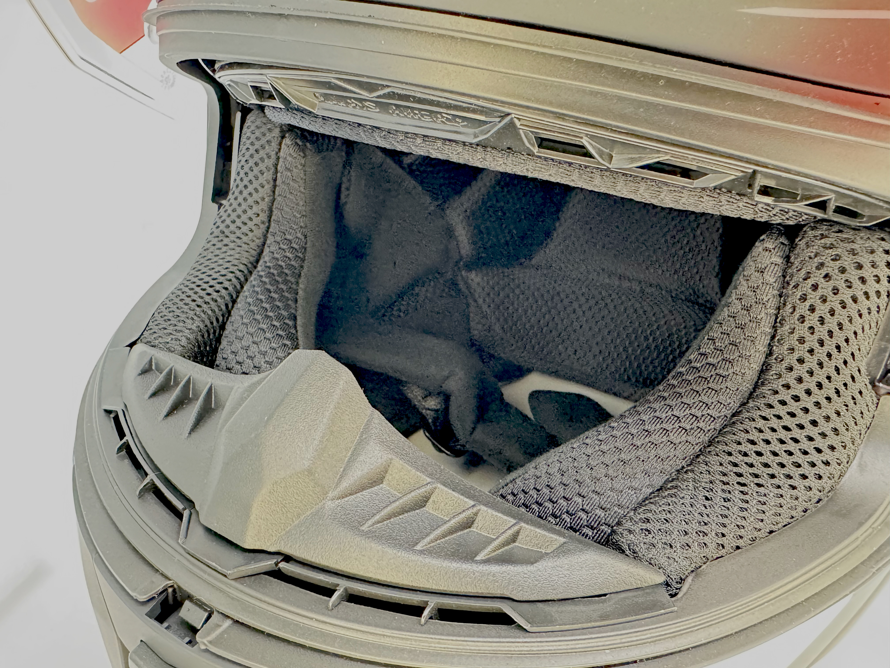 • Входные вентиляционные каналы на подбородочной дуге и в лобовой зоне снабжены регулирующими задвижками. Выходные каналы расположены сзади над и под затылочным спойлером, и в нижней части шлема