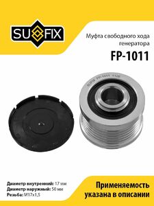 Муфта свободного хода генератора SUFIX FP-1011. Применение: NISSAN Juke 1.6 10> / Qashqai(J10) 2.0 07> / Teana(L33) 2.0 14> / Tiida(C11) 1.8 07-12 / X-Trail(T31) 2.0 07-13, RENAULT Clio IV 1.6 13>.