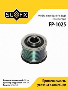 Муфта свободного хода генератора SUFIX FP-1025. Применение: NISSAN Qashqai(J10) 2.0D 07-13 / X-Trail(T31) 2.0D 07-13, MERCEDES-BENZ Citan 1.2 13>, OPEL Movano B 2.3D 10> / Vivaro 1.6D-2.0D 06>, RENAULT Captur 0.9-1.2 13> / Clio IV 1.2 12> / Duster 2.0 12> / Espace IV 2.0D 06> / Kadjar 1.2-1.6D 15> / Kangoo II 1.2 13> / Laguna II-III 2.0D 05> / Master III 2.3D 10> / Megane/Scenic II-IV 1.2-2.0D 05> / .