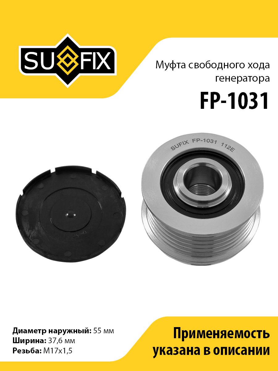 Муфта свободного хода генератора SUFIX FP-1031. Применение: MAZDA 3(BK/BL) 1.6 03> / 6(GG) 1.8-2.3 02-07, MITSUBISHI ASX 1.8-2.0 10> / Lancer 1.8-2.0 08> / Outlander/Airtrek II 2.0-2.4 06>, CITROEN C-Crosser 2.2D-2.4 08>, PEUGEOT 4007 2.2D 07>.