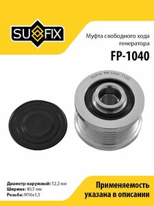 Муфта свободного хода генератора SUFIX FP-1040. Применение: NISSAN Teana(J31/J32) 2.0-2.5 03> / X-Trail(T30 / T31) 2.0-2.5 01> / Primera(P12) 2.0 02>.