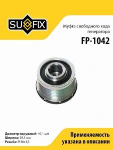 Муфта свободного хода генератора SUFIX FP-1042. Применение: MITSUBISHI Carisma 1.9D 96-06 / Space Star 1.9D 01-04, NISSAN Primastar 1.9D 01> / Interstar 1.9D-2.5D 01>, OPEL Vivaro A 1.9D 01-14 / Movano A 1.9D-2.2D 00>, RENAULT Trafic II 1.9D-2.5D 01> / Megane II 1.9D 02> / Scenic III 2.0 09> / Master II 1.9D-2.5D 01> / Laguna II-III 1.9D-2.0 99> / Grand Scenic III 2.0 09> / Fluence 2.0 10>, VOLVO S40 I 1.9D 00>.