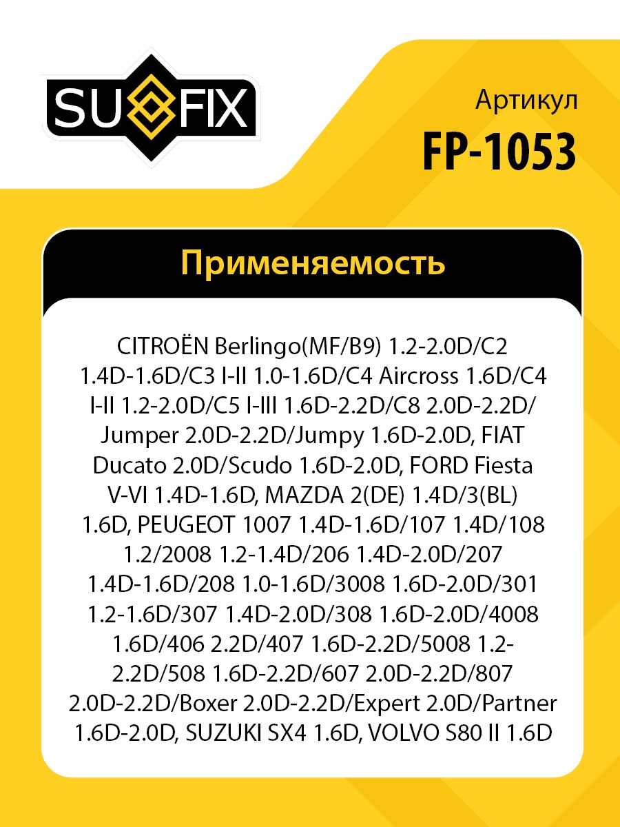 Муфта свободного хода генератора SUFIX FP-1053. Применение: CITROEN Berlingo(MF / B9) 1.2-2.0D 98> / C2 1.4D-1.6D 03> / C3 I-II 1.0-1.6D 02> / C4 Aircross 1.6D 12> / C4 I-II 1.2-2.0D 04> / C5 I-III 1.6D-2.2D 01> / C8 2.0D-2.2D 02> / Jumper 2.0D-2.2D 02> / Jumpy 1.6D-2.0D 96>, FIAT Ducato 2.0D 01> / Scudo 1.6D-2.0D 99>, FORD Fiesta V-VI 1.4D-1.6D 01>, MAZDA 2(DE) 1.4D 08-15 / 3(BL) 1.6D 08-13, PEUGEOT 1007 1.4D-1.6D 05> / 107 1.4D 05> / 108 1.2 14> / 2008 1.2-1.4D 13> / 206 1.4D-2.0D 99> / 207 1.4D-1.6D 06> / 208 1.0-1.6D 12> / 3008 1.6D-2.0D 09> / 301 1.2-1.6D 12> / 307 1.4D-2.0D 04> / 308 1.6D-2.0D 07> / 4008 1.6D 12> / 406 2.2D 00-04 / 407 1.6D-2.2D 04> / 5008 1.2-2.2D 09> / 508 1.6D-2.2D 10> / 607 2.0D-2.2D 01-04 / 807 2.0D-2.2D 02> / Boxer 2.0D-2.2D 02> / Expert 2.0D 00-06 / Partner 1.6D-2.0D 96>, SUZUKI SX4 1.6D 07>, VOLVO S80 II 1.6D 10>.