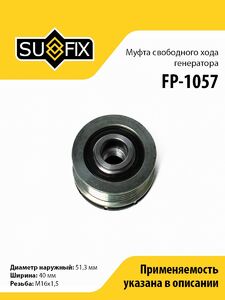 Муфта свободного хода генератора SUFIX FP-1057. Применение: FORD C-Max 1.6 10-19 / Fiesta VI 1.25-1.6 08-17 / Focus III 1.6 10> / Kuga II 1.6 13-15 / Mondeo IV 1.6 11-15 / S-max 1.6 11-14 / Tourneo Connect 1.6 13>, VOLVO S80 II 1.6 11> / S60 II 1.6 10> / V70 III 1.6 11> / V40 1.6 12>.