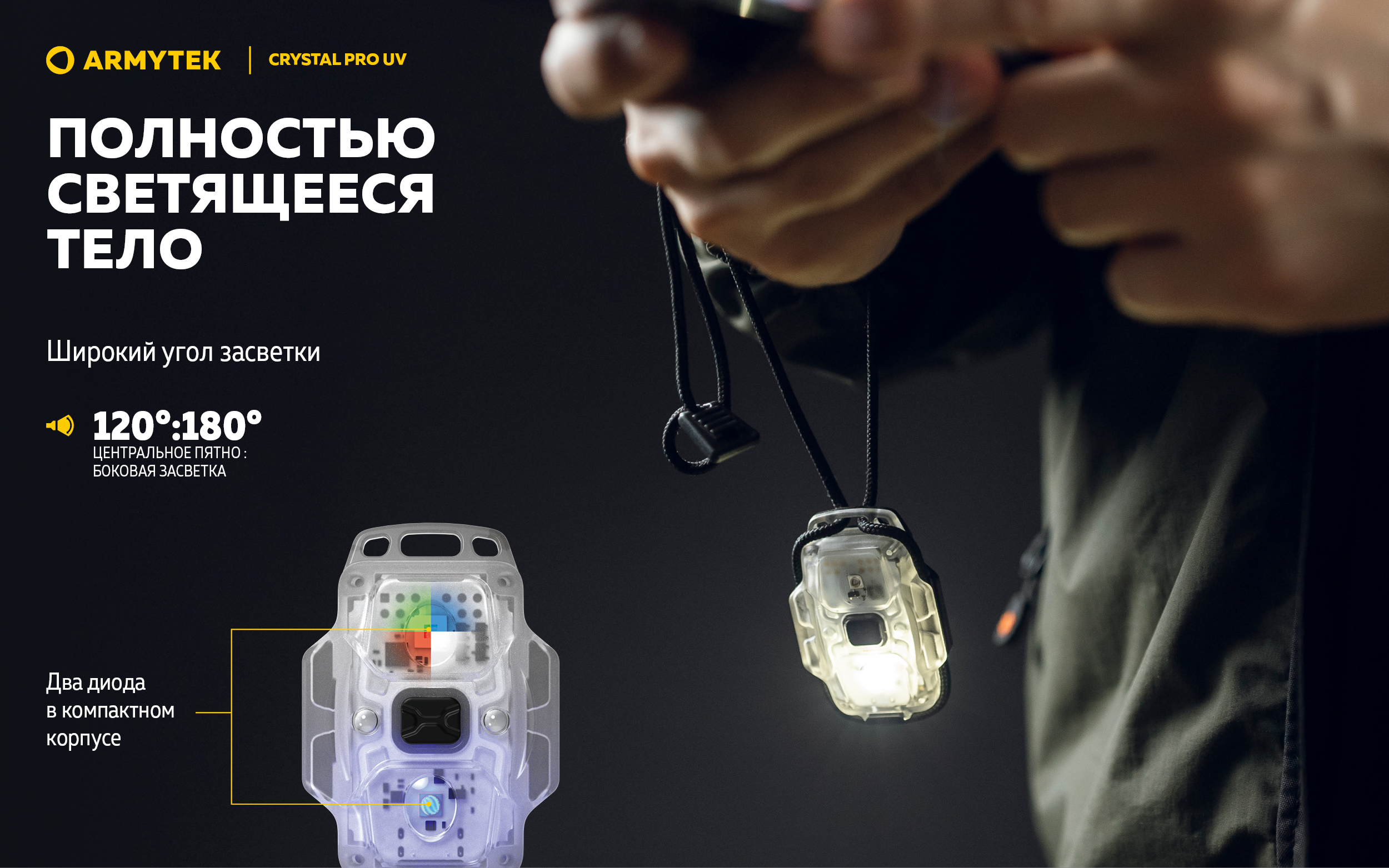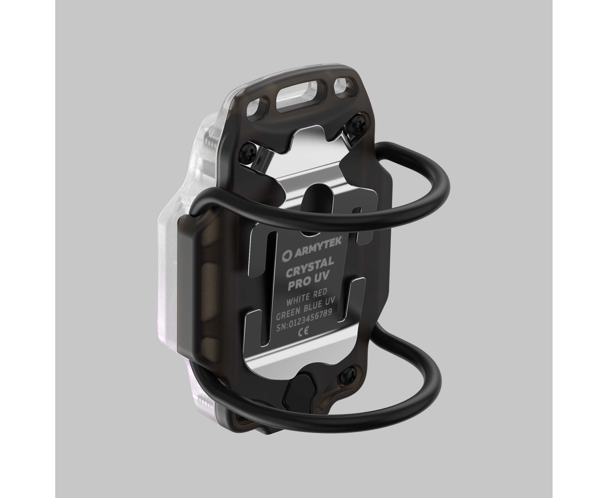Crystal Pro UV можно использовать в качестве налобного фонаря, фиксировать на ремне или одежде, в том числе специализированной униформе, носить на ремешке или вместе с ключами. Модель также устанавливается на велосипеде с использованием силиконовых колец. Материал корпуса и особое расположение диодов обеспечивают широкий угол света в 180°, оптимальный для применения на близком расстоянии.