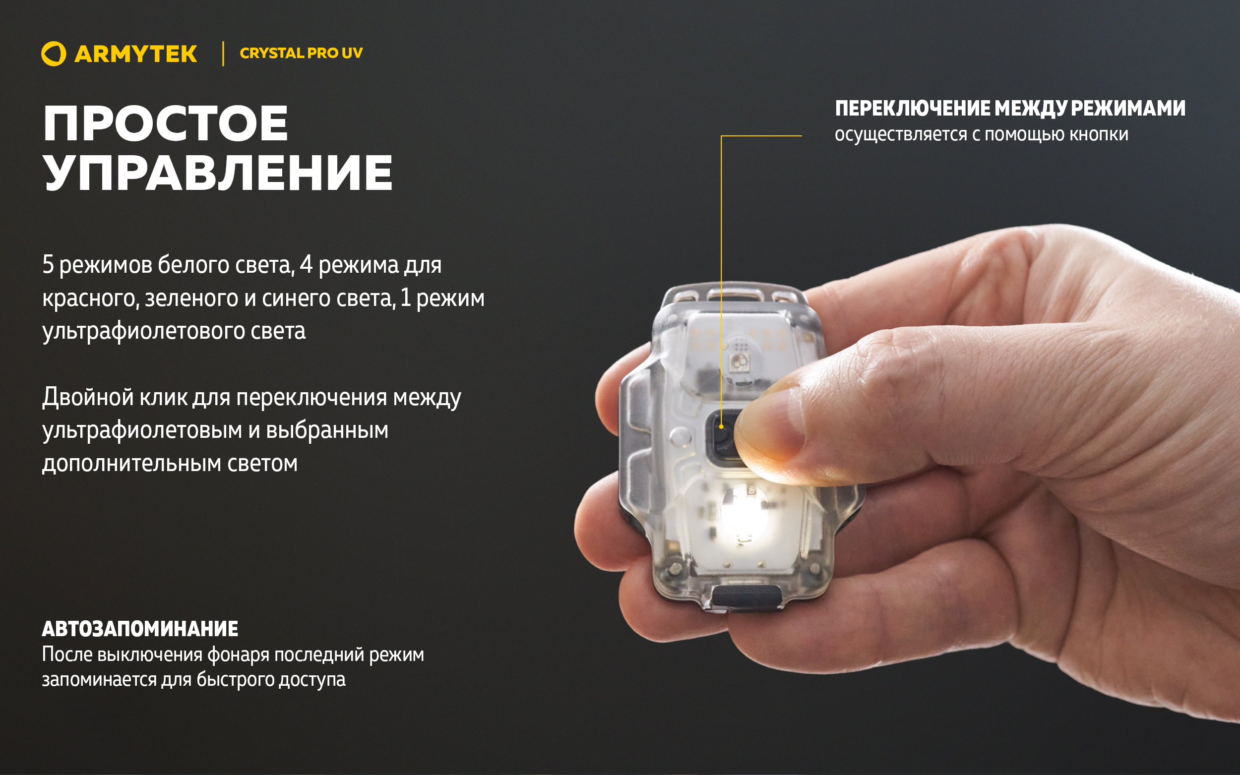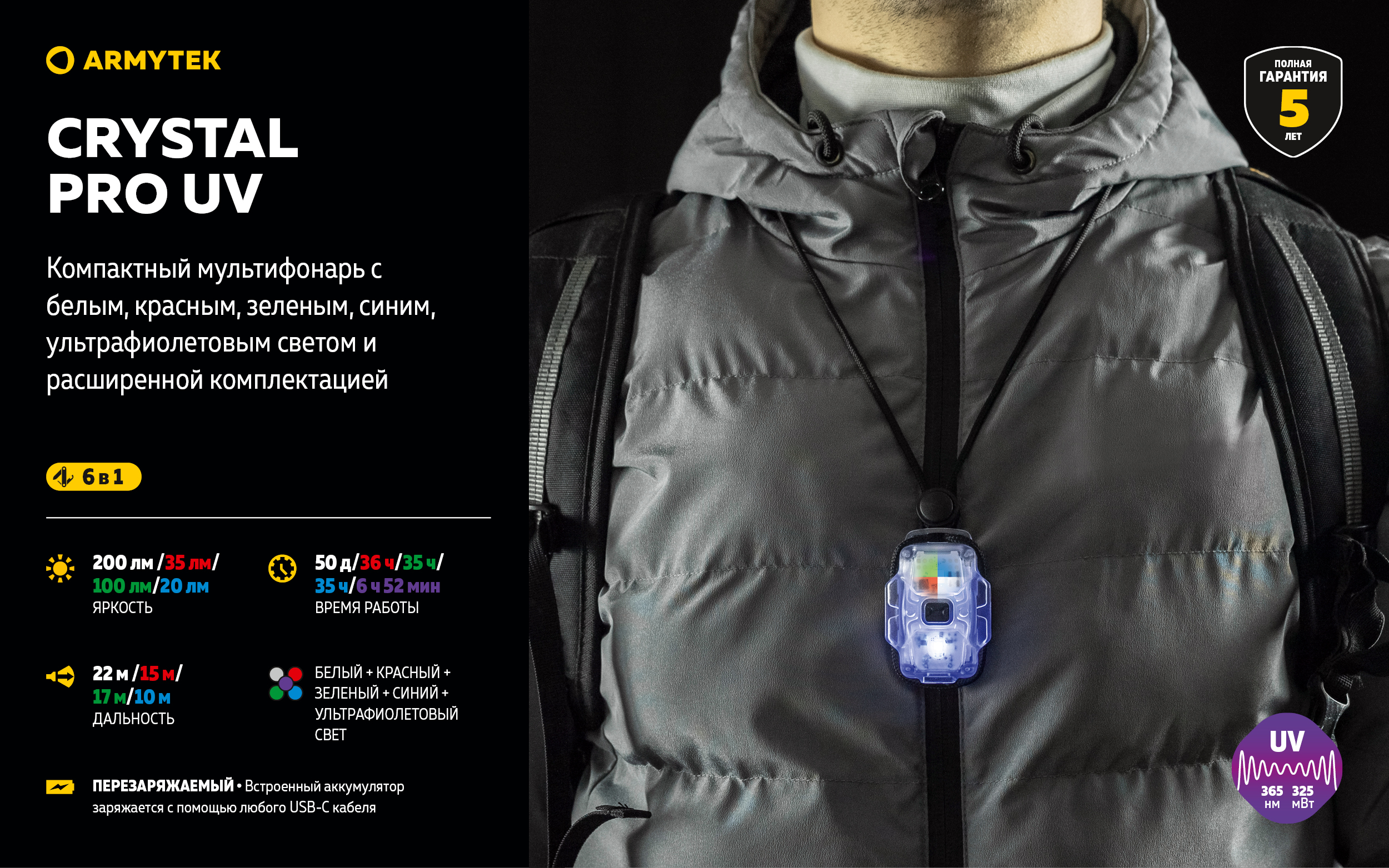 Модель из обновленной линейки компактных мультифонарей. Crystal Pro UV — это универсальный фонарь, который сочетает в себе самые популярные варианты света. Белый, красный, зеленый, синий и ультрафиолетовый световые потоки дают еще больше возможностей применения фонаря в быту или в профессиональной деятельности.