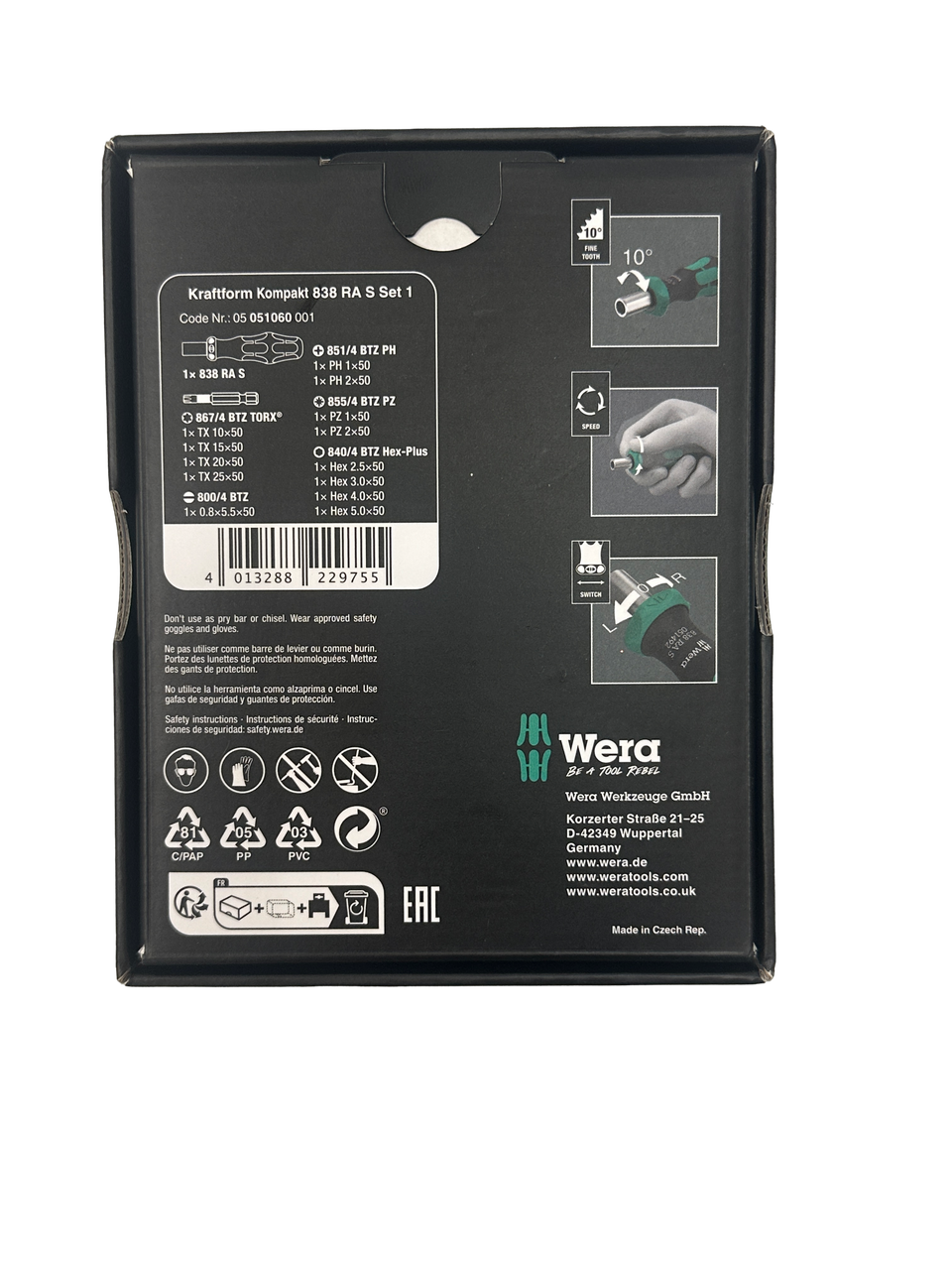 Трещоточная отвёртка в наборе из 14 предметов. Ручка-битодержатель с интуитивно понятной для работы функцией трещотки. "Вёрткость" ускоряет процесс завинчивания. Трещоточный механизм, полностью упрятанный в ручку, делает завинчивание удобным и малоутомительным. Эргономичное переключение на реверс или нулевое положение. Ручка Kraftform Plus для комфортной работы без появления на руках мозолей и волдырей. С магнитным битодержателем под шестигранный хвостовик 1/4". 13 закалённых до вязкой твёрдости битов для универсального применения (Phillips, Pozidriv, TORX®, внутренний шестигранник и прямой шлиц), длиной 50 мм; с химическим никелированием, часть из них с идентификатором инструментов Take it easy: цветовая кодировка профиля и маркировка размера для быстрого отбора нужного бита.