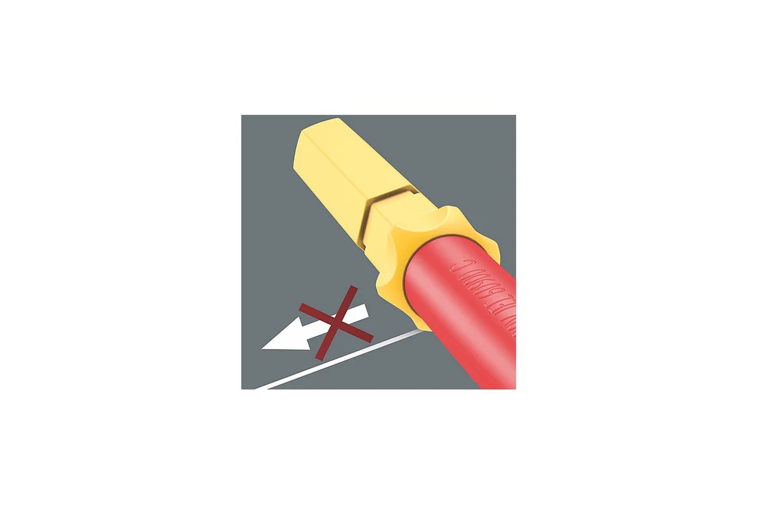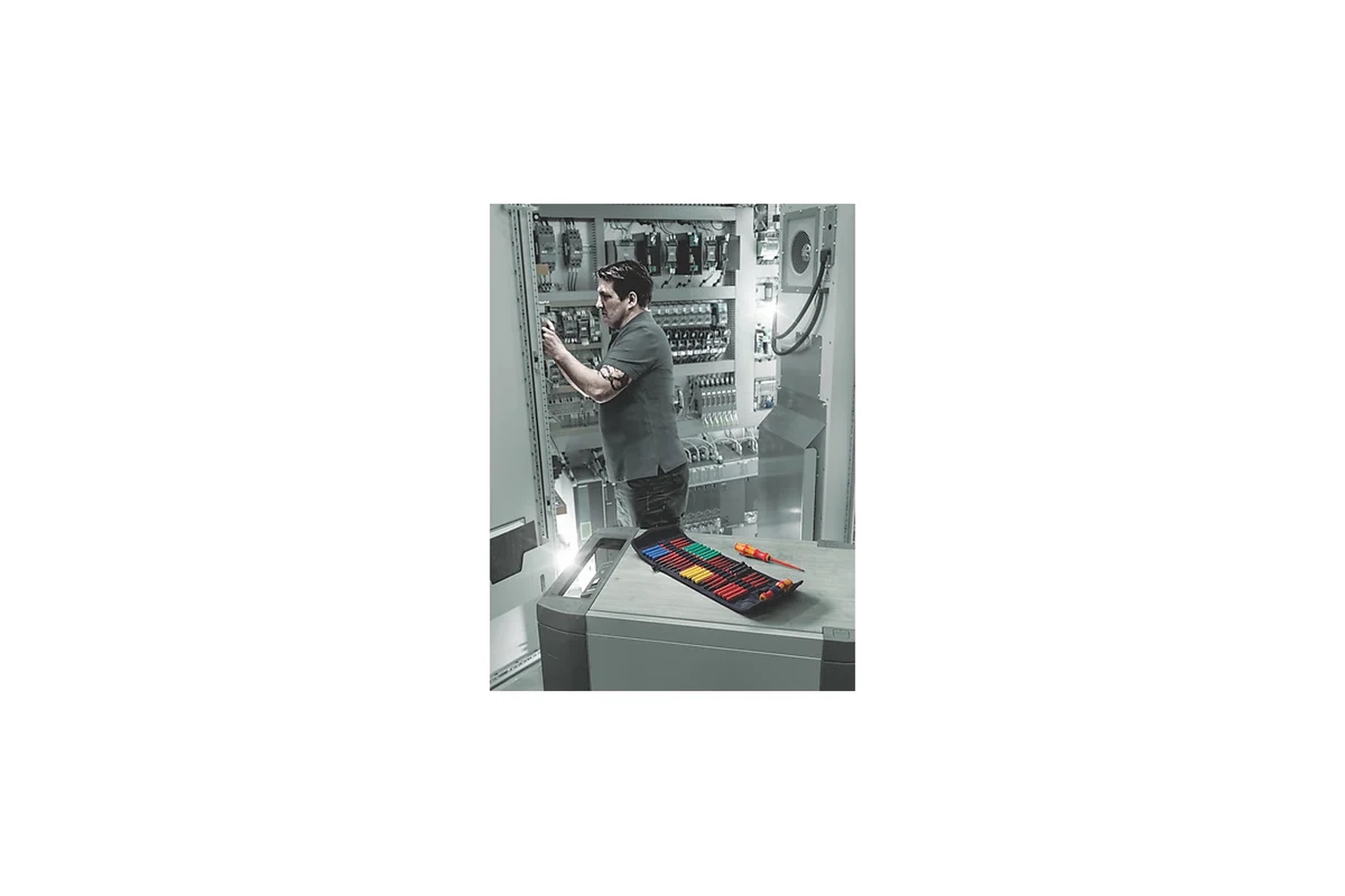 - Сменные отвёртки VDE (длиной 157 мм) с практичной функцией вёрткого вращения, с защитой от перекатывания и идентификатором инструментов Take it easy: цветовая кодировка профиля и лазерная гравировка размера