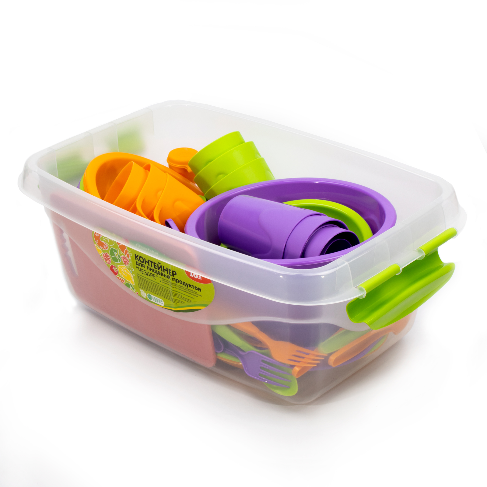 Контейнер, 16л (1 шт); миска с крышкой(1 шт); тарелка для вторых блюд (6 шт); тарелка для первых блюд (6 шт);тарелка-блюдо (2 шт); вилка (6 шт); ложка (6 шт); стакан для холодных напитков (6 шт); стакан для горячих напитков (6 шт); стопка (6 шт); емкость для специй (2 шт); доска разделочная (1 шт).