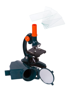 Микроскоп имеет широкий диапазон увеличений. Вращением револьверной головки можно выбрать одну из фиксированных кратностей – 300х, 600х, 1200х. Для освещения образцов используется зеркало или встроенная подсветка. Для работы последней требуются две батарейки типа АА (нет в комплекте). Предметный столик имеет специальные зажимы для фиксации образцов, для настройки резкости изображения его можно перемещать по вертикали.