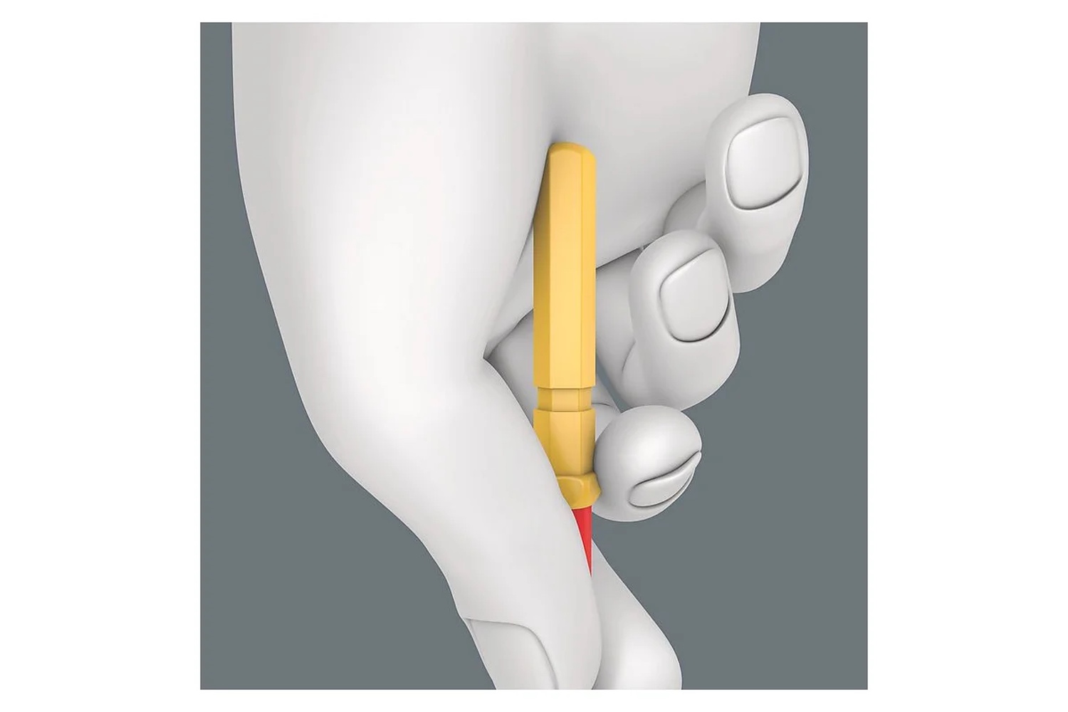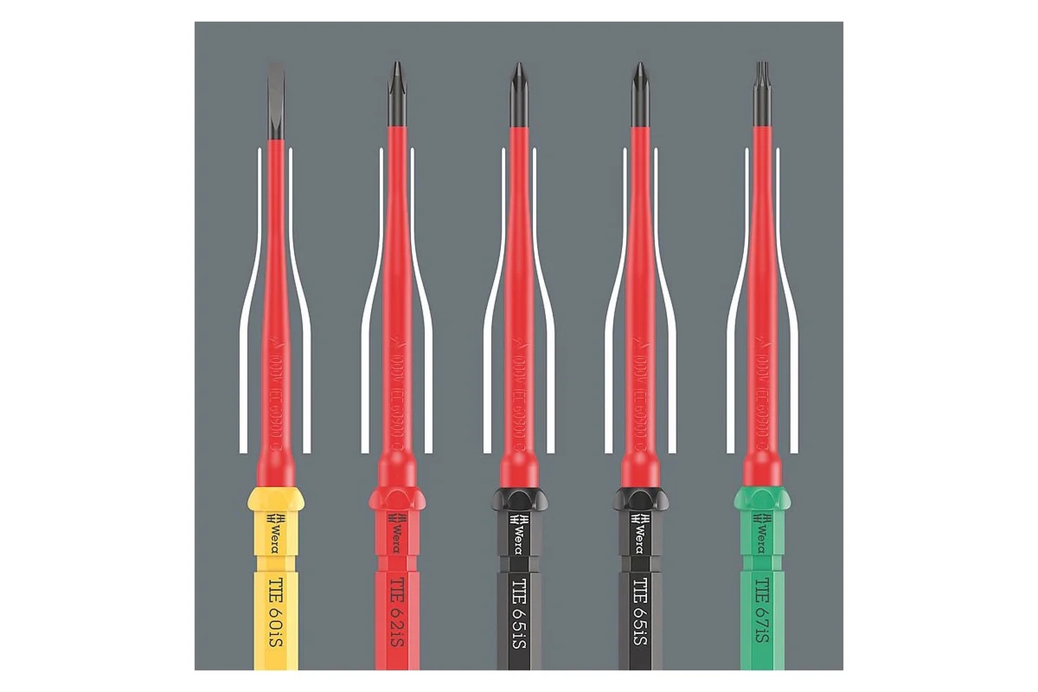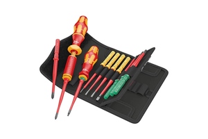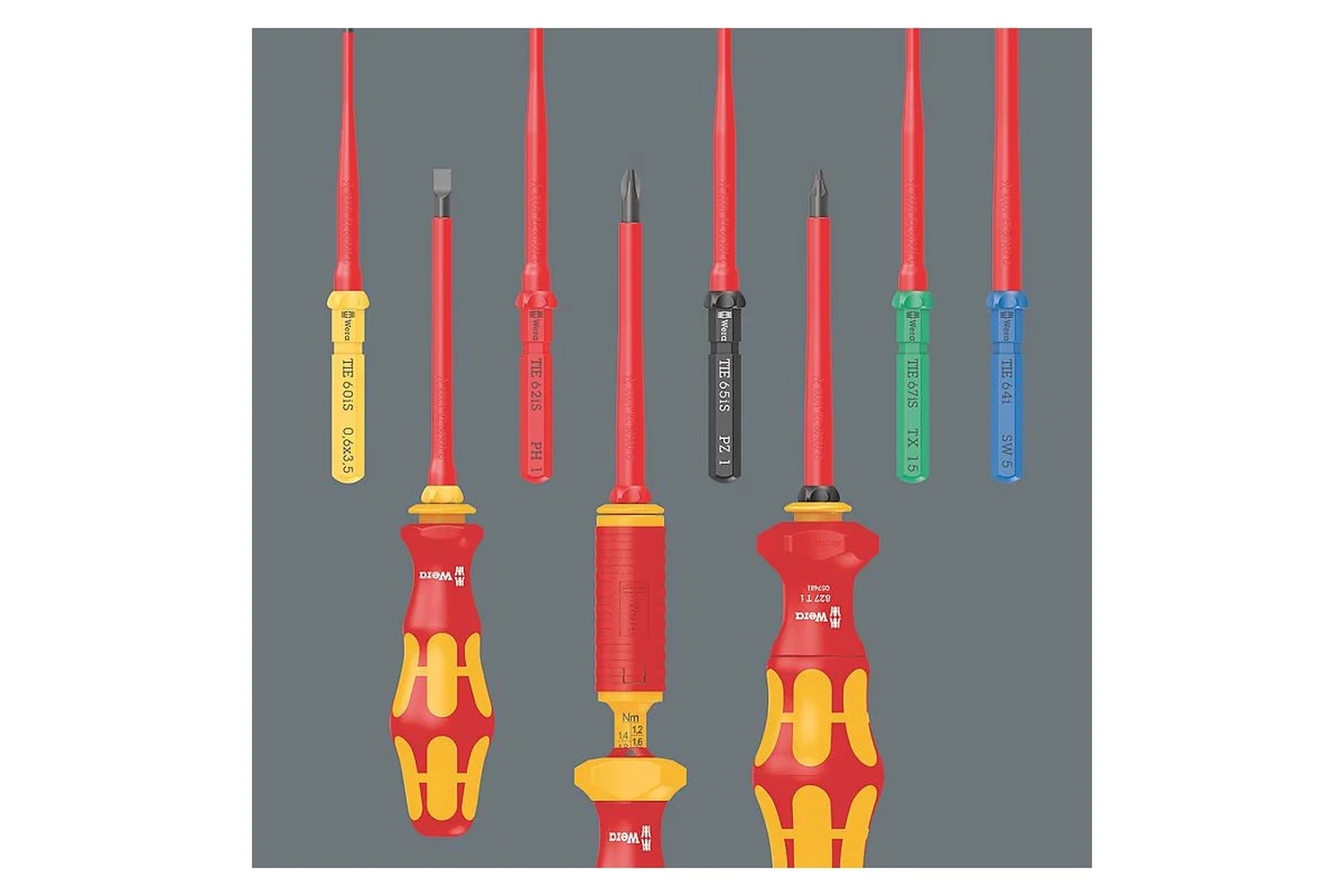 Набор сменных отвёрток VDE для динамометрической ручки-держателя. 16 предметов, включая 14 сменных отвёрток с защитной изоляцией (в т.ч. 12 с зауженным рабочим концом). С идентификатором инструментов Take it easy: цветовая кодировка профиля и лазерная гравировка размера для простого и быстрого отбора нужного инструмента. Динамометрическая ручка-держатель VDE с регулировкой момента затяжки 1,2-3,0 Нм и ручка-держатель 817 VDE. Обе с эргономичной ручкой Kraftform Plus, твёрдые зоны которой служат для высокой скорости работы, а мягкие зоны обеспечивают передачу больших моментов силы.