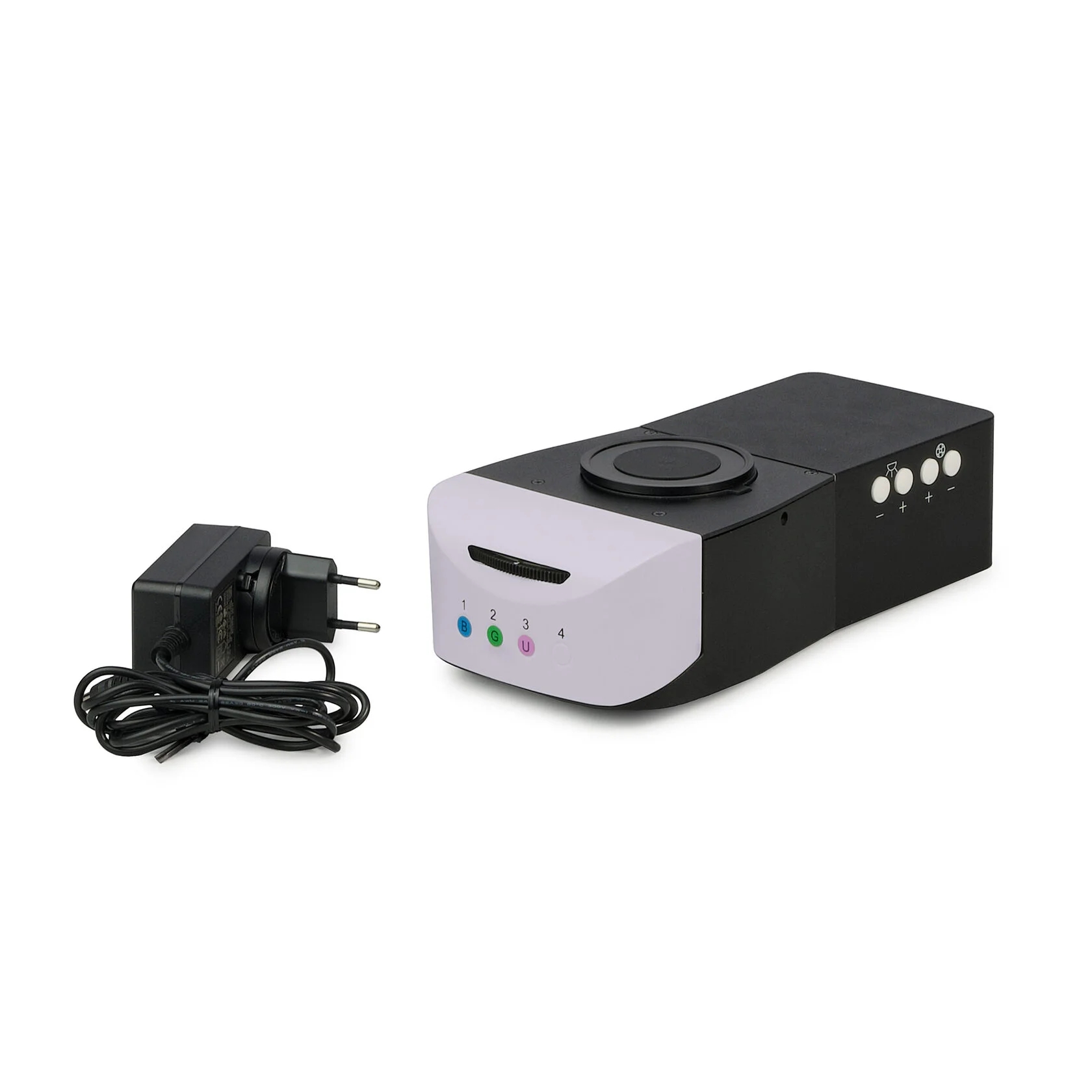 Насадка устанавливается в оптический путь между визуальной насадкой и штативом. В корпусе насадки находится поворотная четырехпозиционная турель с тремя широкополосными люминесцентными фильтрами разных волновых диапазонов свечения: синий (В), зеленый (G) и ультрафиолетовый (UV). Рабочий фильтр вводится в ход лучей нажатием на кнопку. Одна кнопка на насадке поворачивает турель до следующего фильтра по часовой стрелке, другая – против часовой стрелки. Одно положение турели соответствует наблюдениям в светлом поле в проходящем свете.