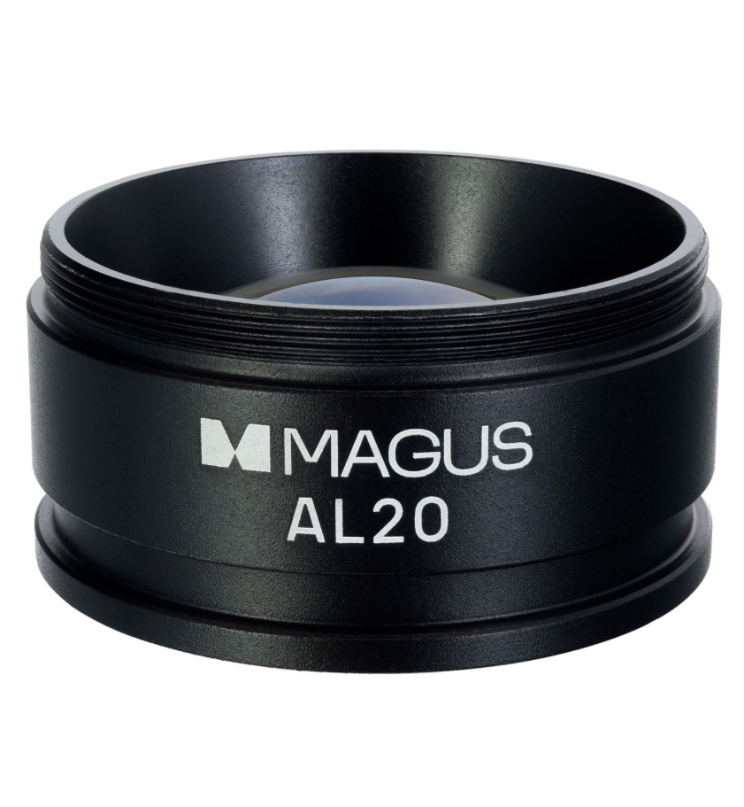 Насадка MAGUS AL20 вдвое увеличивает кратность микроскопа, но укорачивает рабочую дистанцию объектива и сужает поле зрения. Она полезна в ситуациях, когда установка окуляров с большим увеличением не позволяет достичь нужного приближения. Также насадку применяют при работе с цифровой камерой: цифровое изображение формируется без участия окуляров, поэтому повысить кратность можно только за счет использования насадки на объектив.