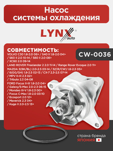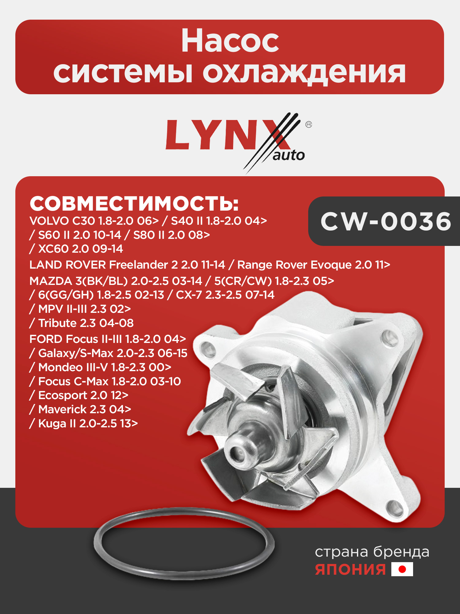Насос системы охлаждения LYNXauto CW-0036. Применение: FORD Focus II-III 1.8-2.0 04> / Focus C-Max 1.8-2.0 03-10 / Ecosport 2.0 12> / Galaxy/S-Max 2.0-2.3 06-15 / Maverick 2.3 04> / Kuga II 2.0-2.5 13> / Mondeo III-V 1.8-2.3 00>, LAND ROVER Freelander 2 2.0 11-14 / Range Rover Evoque 2.0 11>, MAZDA 3(BK/BL) 2.0-2.5 03-14 / 5(CR/CW) 1.8-2.3 05> / 6(GG/GH) 1.8-2.5 02-13 / CX-7 2.3-2.5 07-14 / MPV II-III 2.3 02> / Tribute 2.3 04-08, VOLVO C30 1.8-2.0 06> / S40 II 1.8-2.0 04> / S60 II 2.0 10-14 / S80 II 2.0 08> / XC60 2.0 09-14.