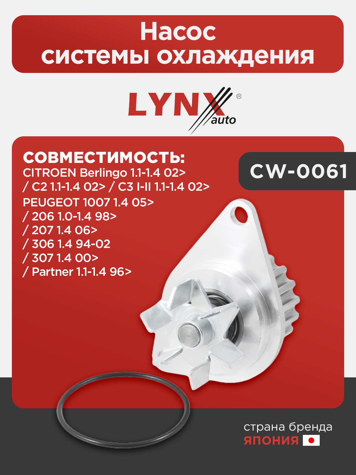 Насос системы охлаждения LYNXauto CW-0061. Для CITROEN Berlingo 1.1-1.4 02> / C2 1.1-1.4 02> / C3 I-II 1.1-1.4 02>, PEUGEOT 1007 1.4 05> / 206 1.0-1.4 98> / 207 1.4 06> / 306 1.4 94-02 / 307 1.4 00> / Partner 1.1-1.4 96>