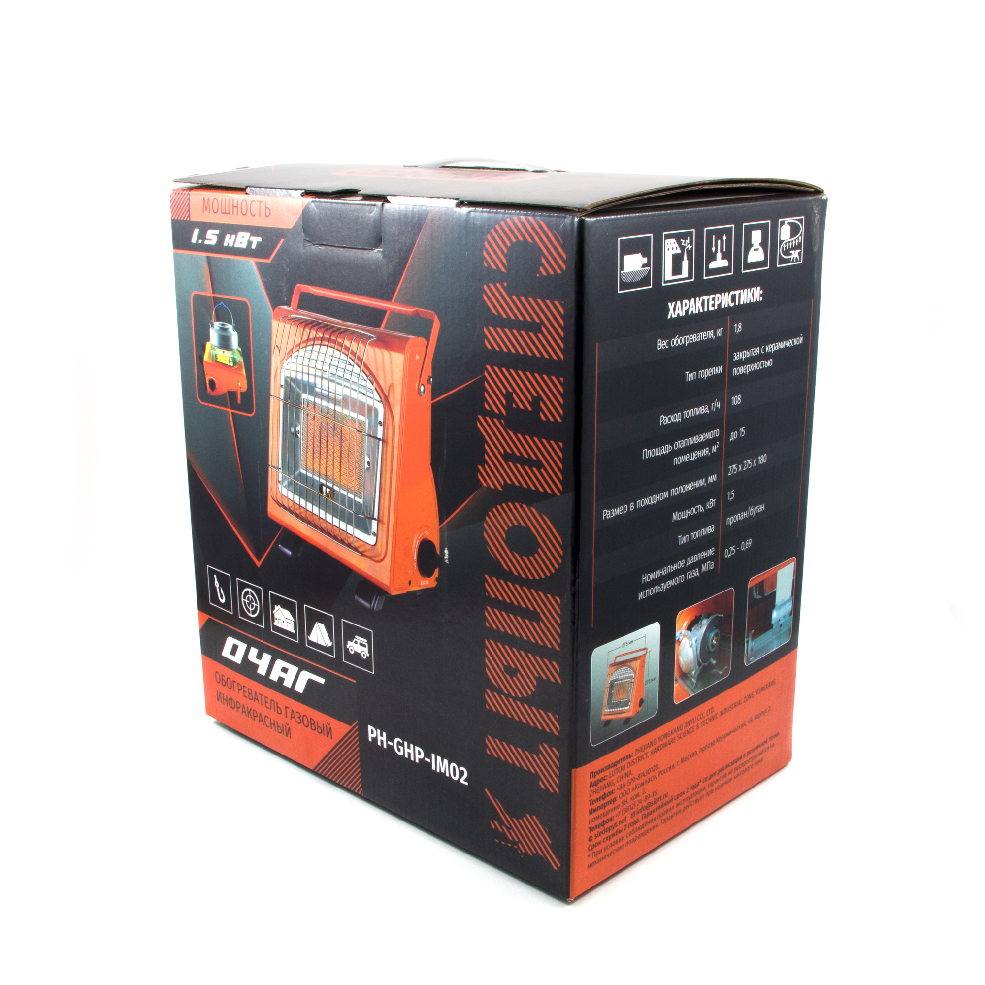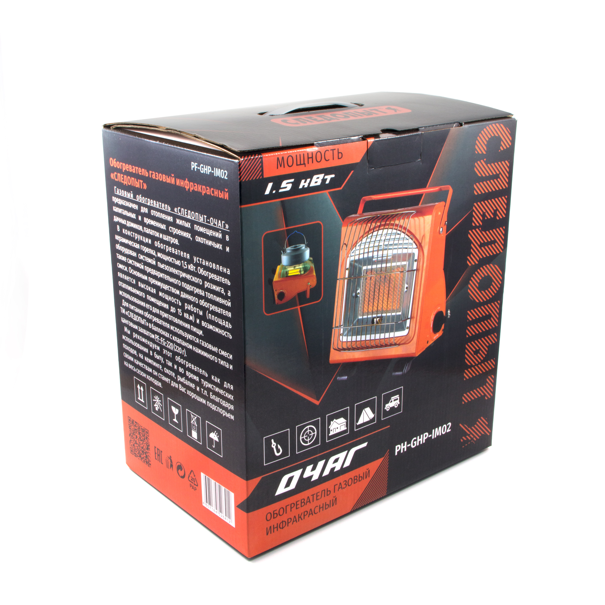 Обогреватель инфракрасный газовый «СЛЕДОПЫТ-Очаг» — идеальное решение для отопления жилых помещений, охотничьих и дачных домиков, палаток и шатров, при наличии вентиляции. Оснащён керамической газовой горелкой мощностью 1,5 кВт и системой пьезоэлектрического розжига и системой предварительного подогрева газовой смеси. Преимущества: Большая площадь отапливаемого помещения (до 15 кв. м.). Возможность использования для приготовления пищи в качестве плитки. Используется сжиженное газовое топливо ТМ "Следопыт" в баллонах с клапаном нажимного типа и цанговым захватом 220 г. Обогреватель-плита рекомендован для использования в быту и во время туристических походов, в кемпинге, охоте и рыбалке. Отличное решение на холодный сезон.