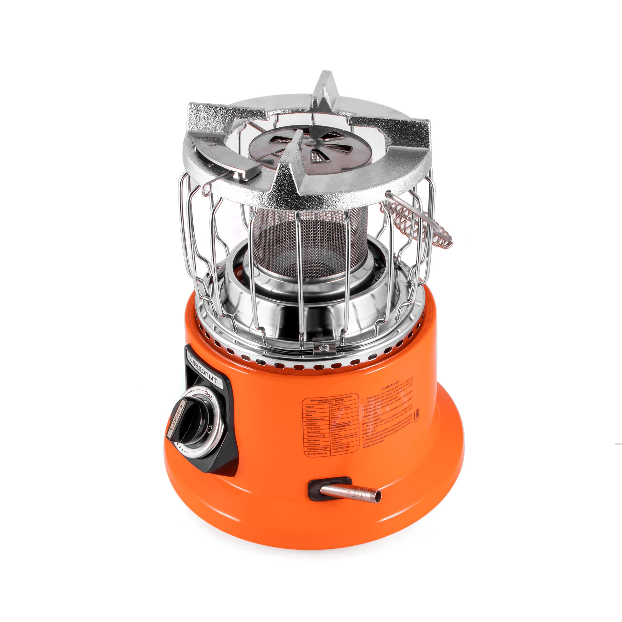 Газовый обогреватель СЛЕДОПЫТ Норд — универсальное решение для обогрева и приготовления пищи. Работает на бытовом газовом баллоне через РДСГ (в комплект не входит) и оснащён специальным выходом для подключения к шлангу.