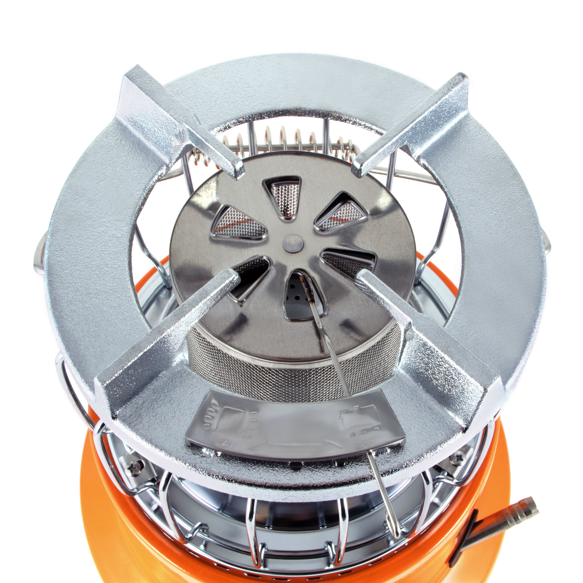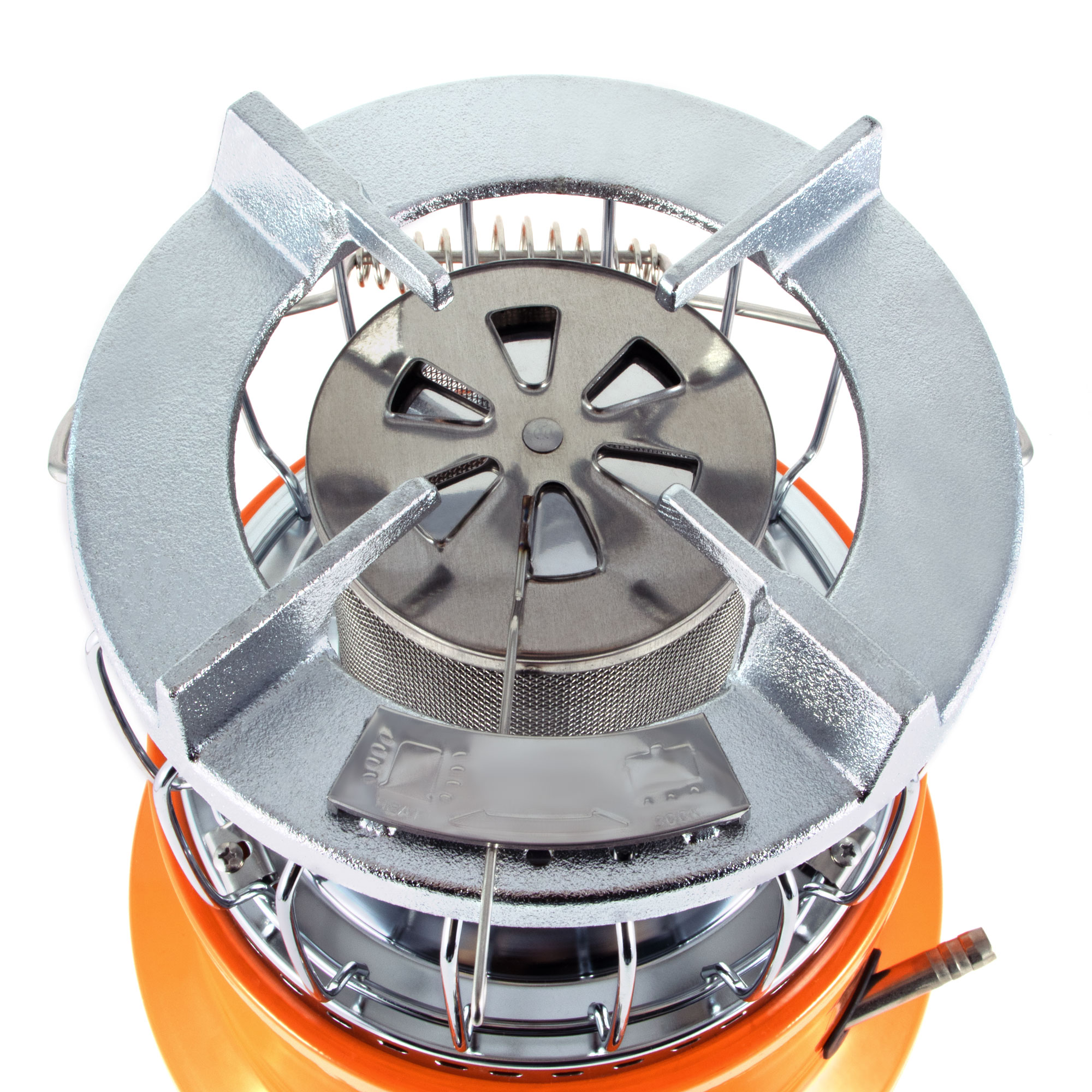 Переключение между режимами обогревателя и плиты осуществляется с помощью заслонки. Складная ручка обеспечивает удобство переноски.