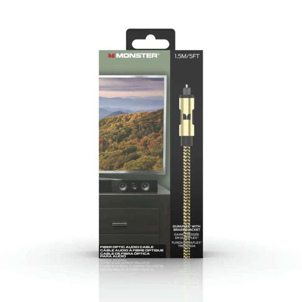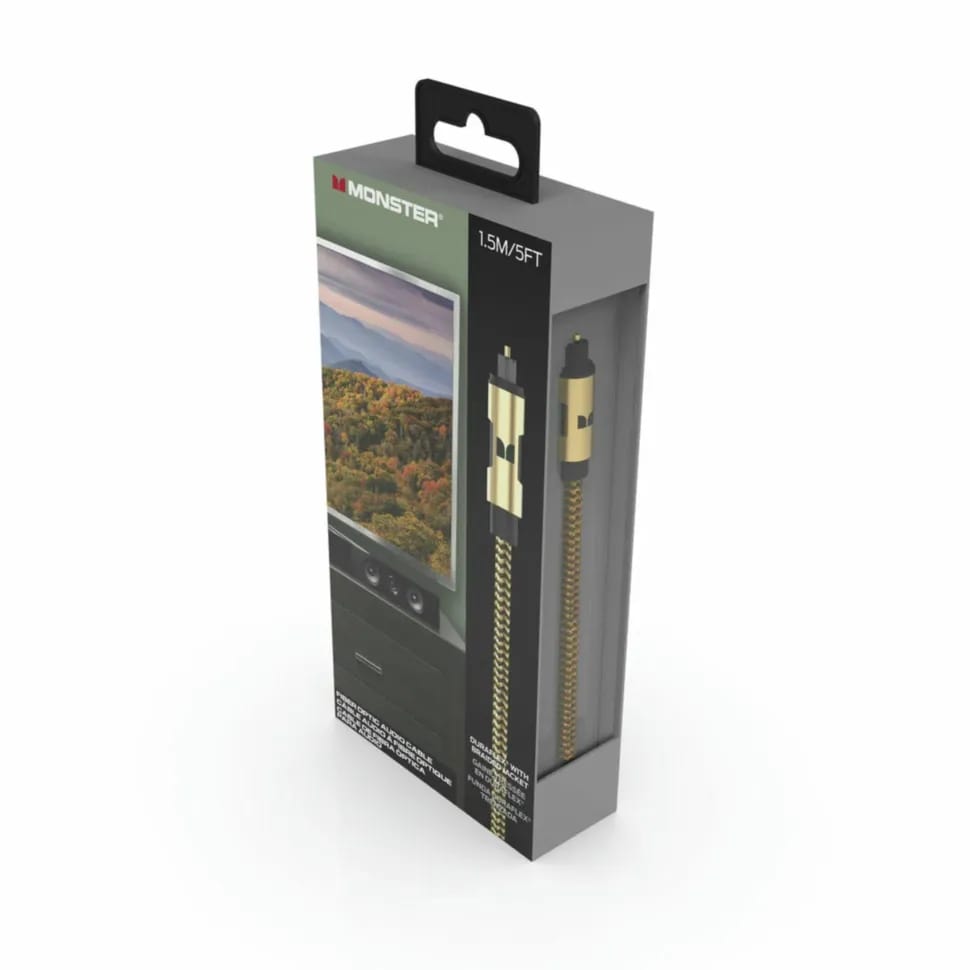 Цифровой оптоволоконный кабель Monster Cable Essentials GOLD предназначен для подключения аудиооборудования по интерфейсу Toslink. Передача двухканального и многоканального аудиосигнала в форматах Dolby Digital и DTS осуществляется по протоколу S/PDIF по оптоволокну.