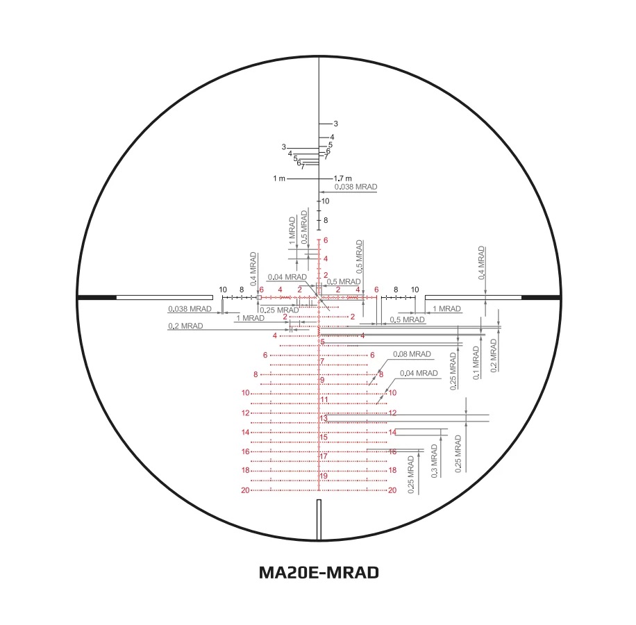 - Баллистическая прицельная сетка MA20E-MRAD, расположение – первая фокальная плоскость (FFP)