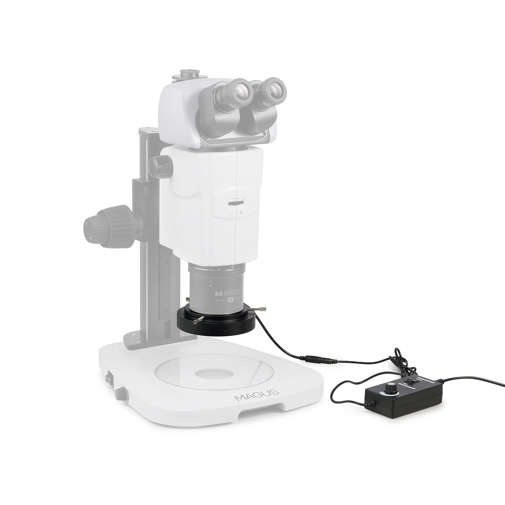 Кольцевой светодиодный осветитель с матовым рассеивателем предназначен для получения яркого, равномерного и бестеневого освещения объекта отраженным светом. Устанавливается непосредственно на объектив стереомикроскопа со схемой Аббе, благодаря чему световой поток направляется коаксиально – это особенно важно при исследовании плоских, глянцевых или малоконтрастных образцов.