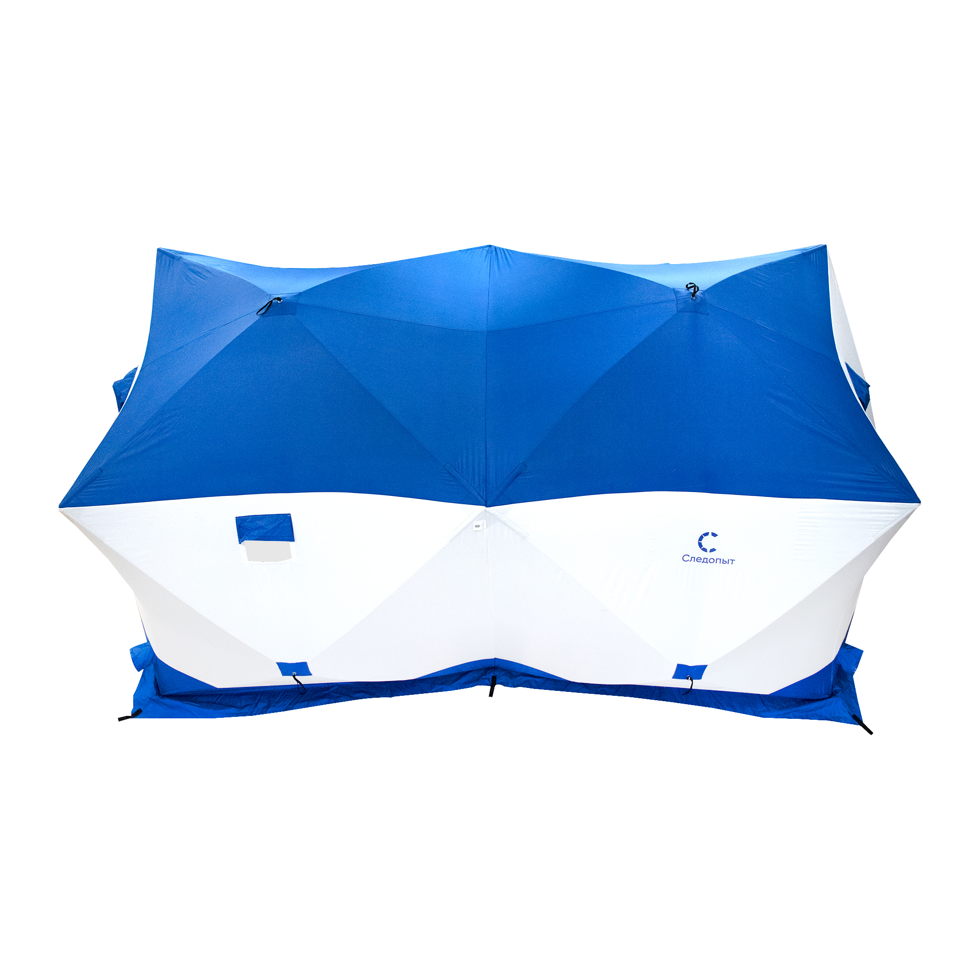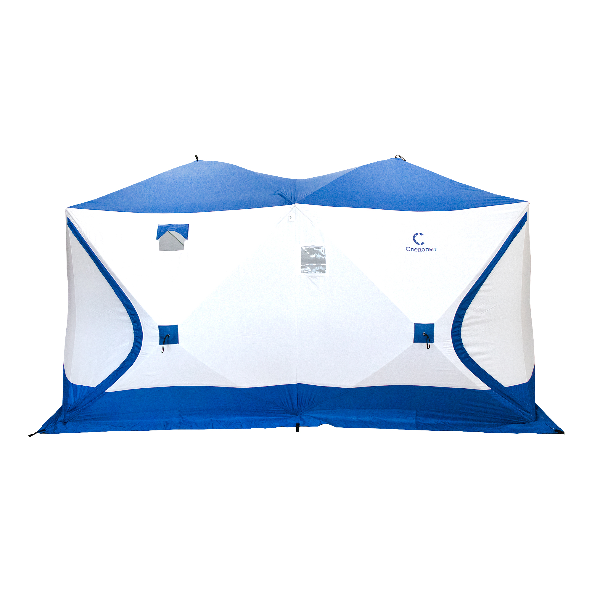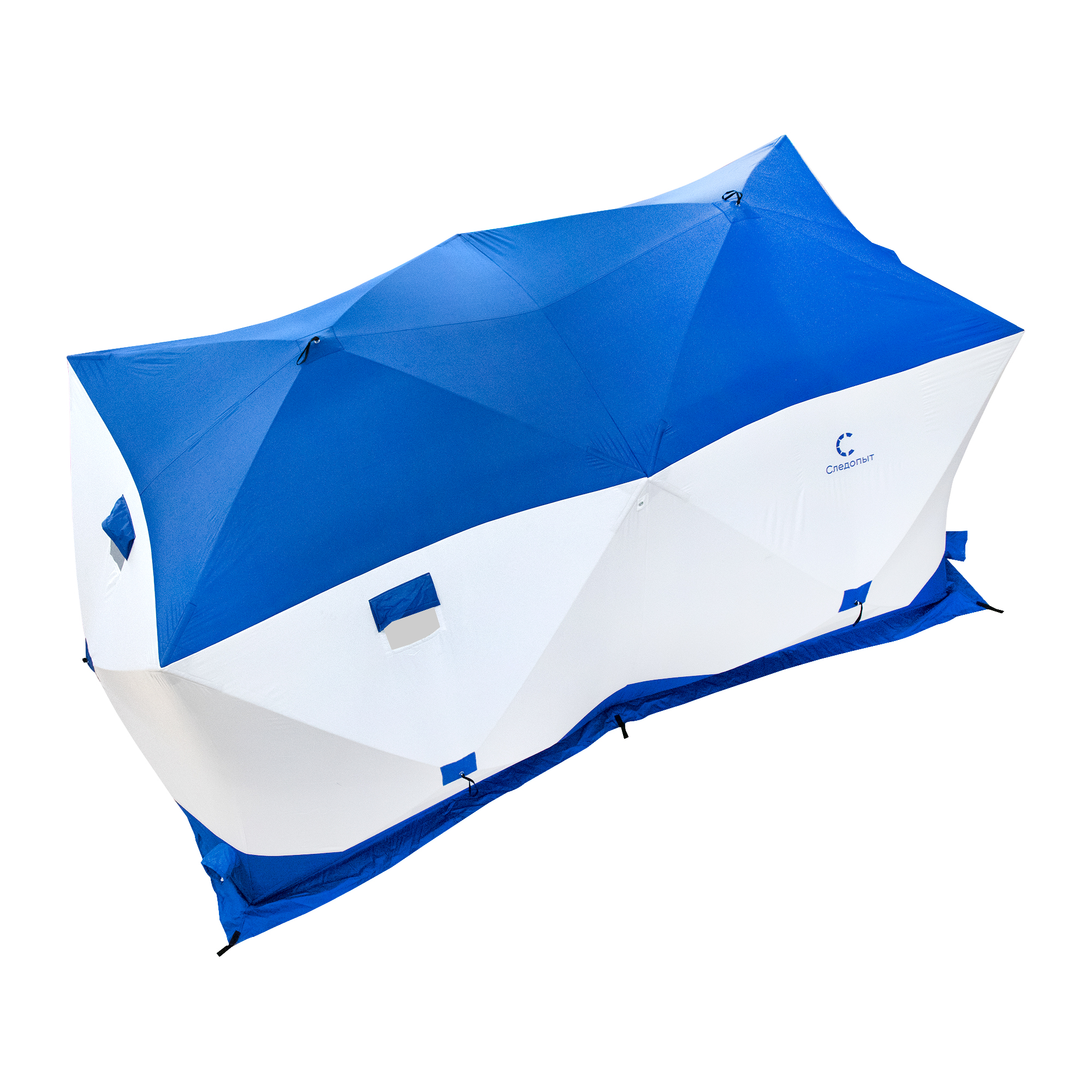 Палатка зимняя куб СЛЕДОПЫТ, 3,8х1,9 м, 2-х комнатная, S по полу 7,2 кв.м, 3 слоя, цвет синий/белый