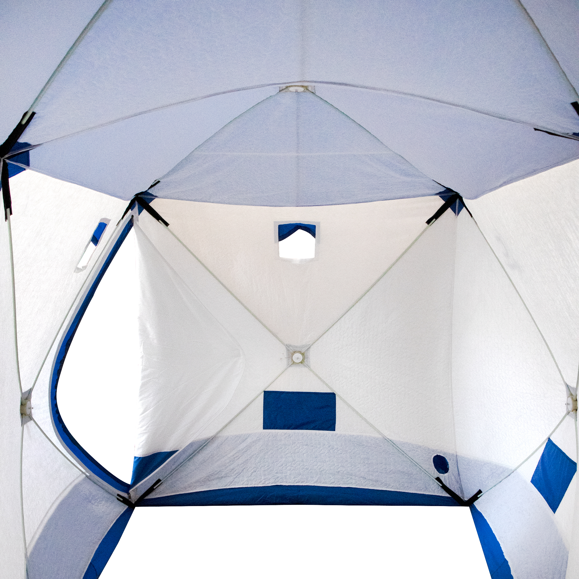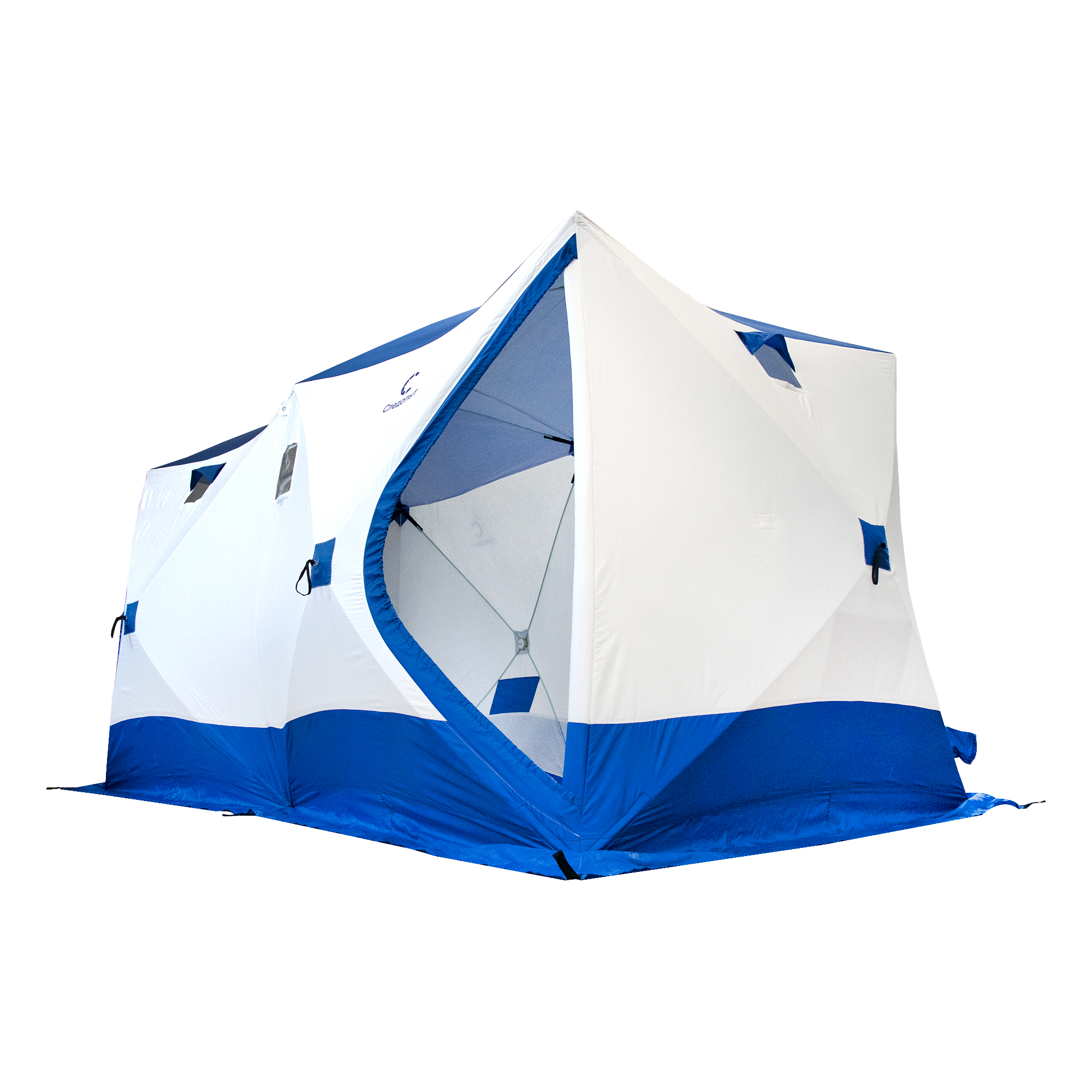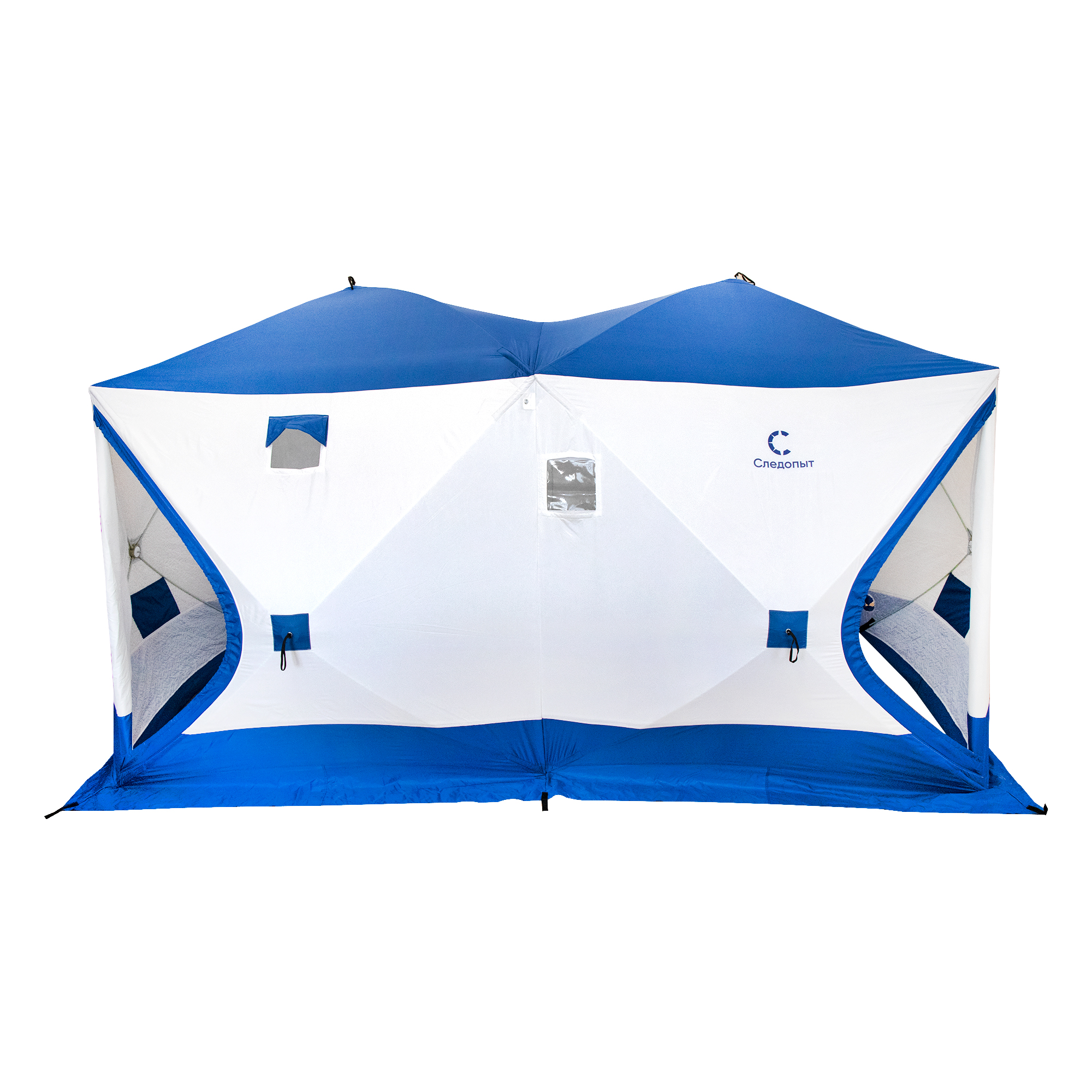 Палатка зимняя куб СЛЕДОПЫТ, 3,8х1,9 м, 2-х комнатная, S по полу 7,2 кв.м, 3 слоя, цвет синий/белый