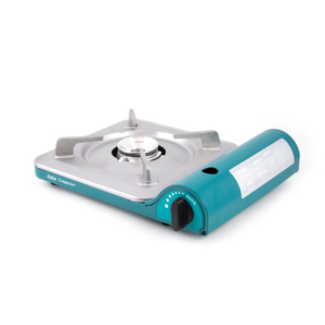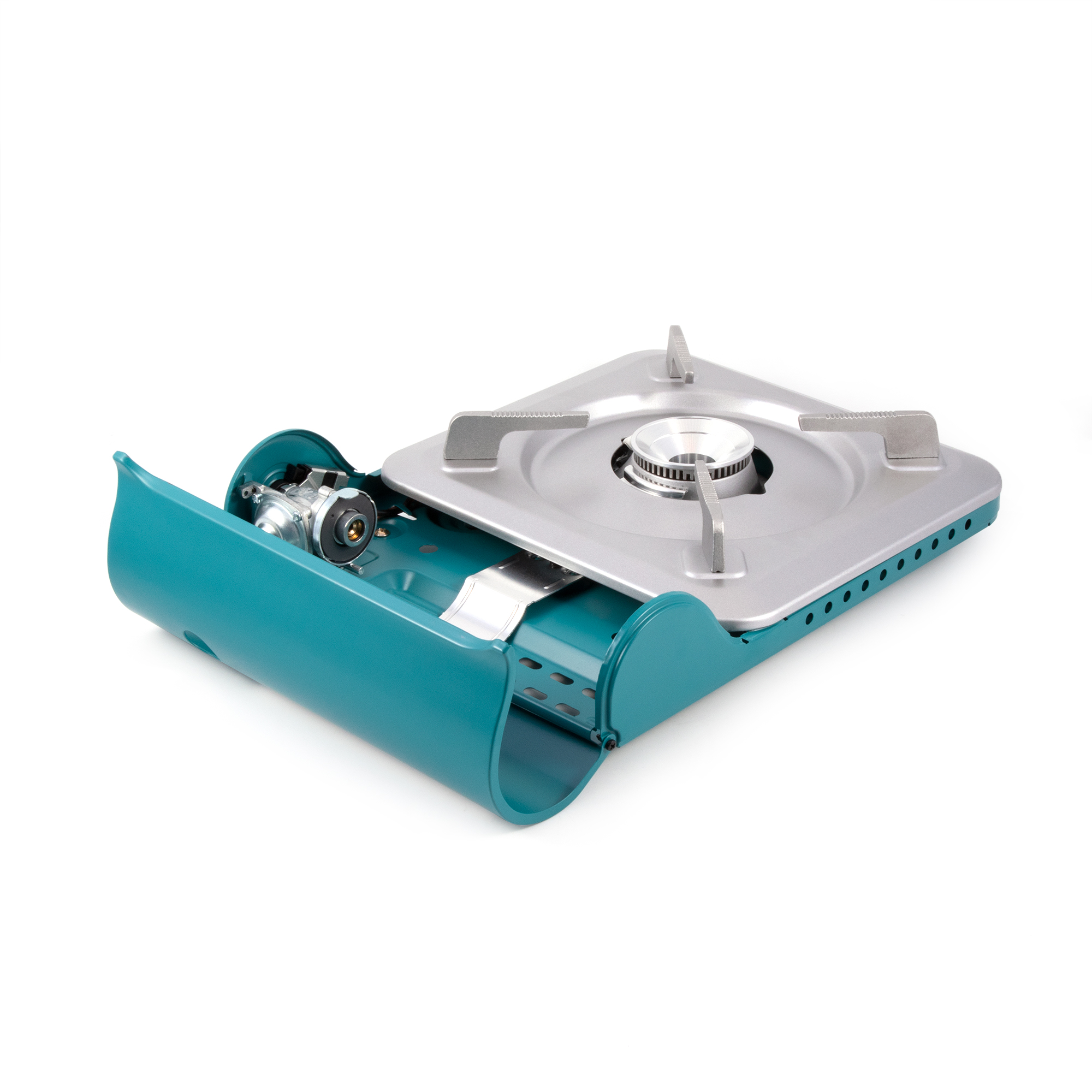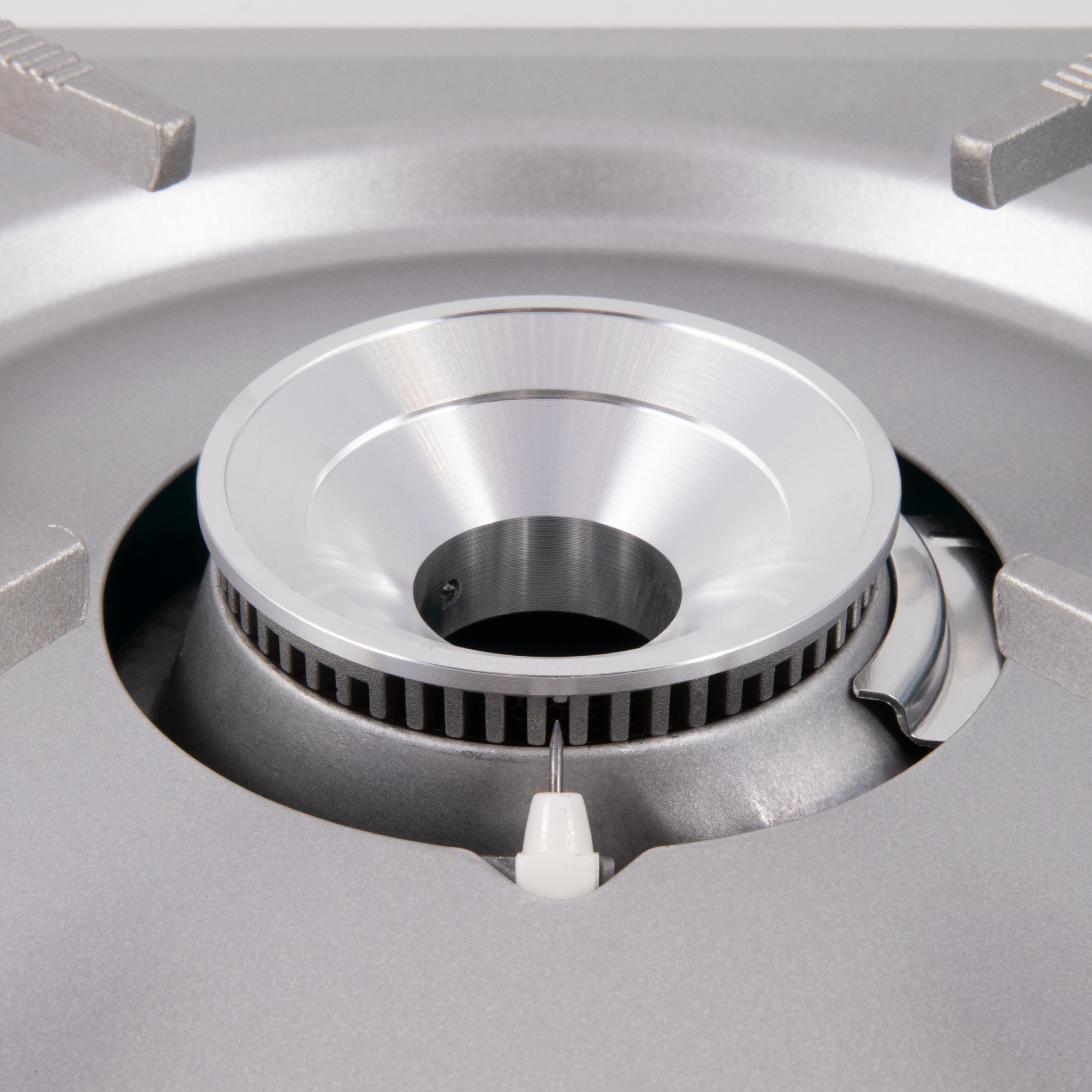 Оснащена одной горелкой с кольцевым пламенем, пьезоэлектрическим розжигом, блоком управления подачей газа и системой контроля избыточного давления. Для подключения баллона используется магнитный кольцевой захват, обеспечивающий быструю и надёжную фиксацию. Отверстие редуктора закрыто защитным пластиковым колпачком.