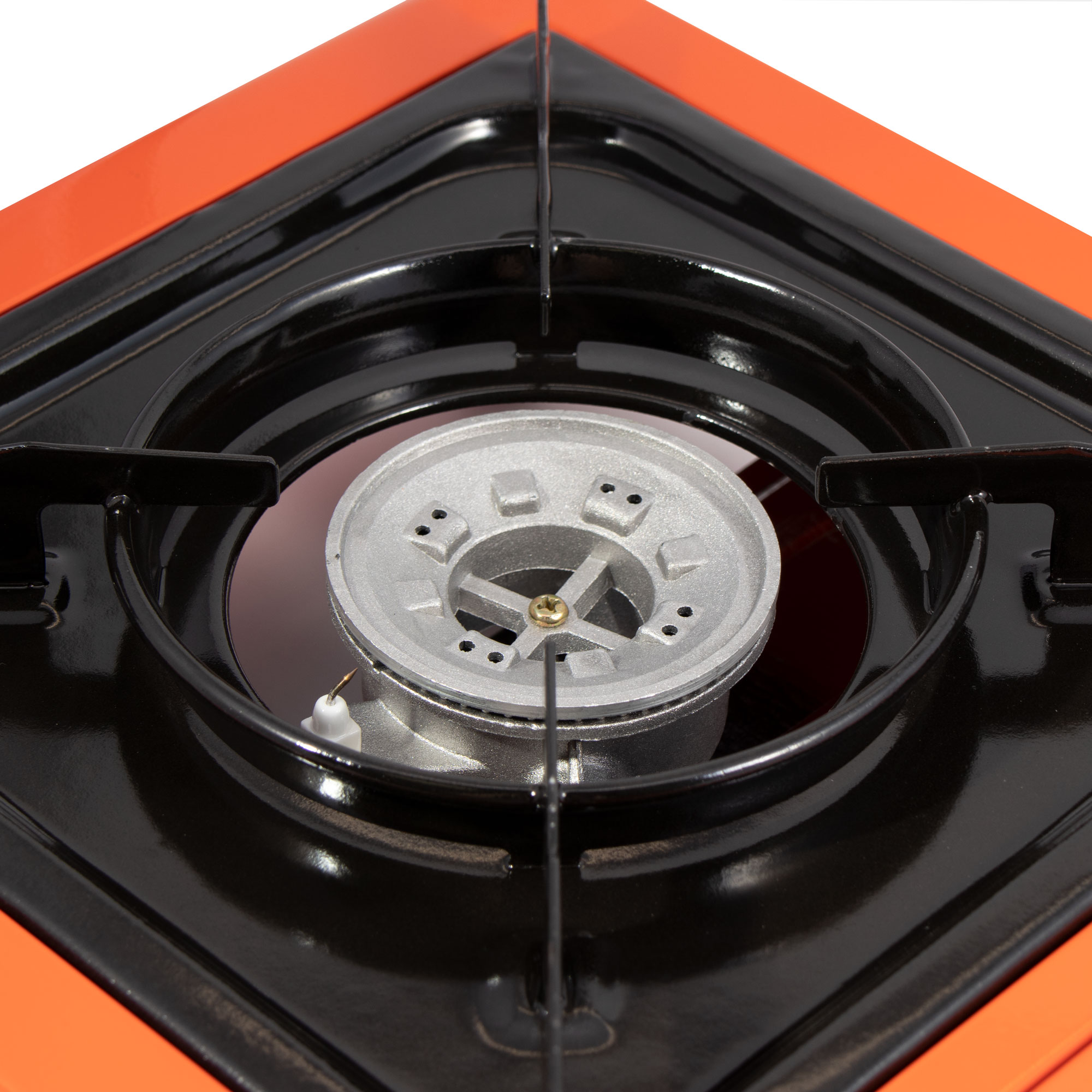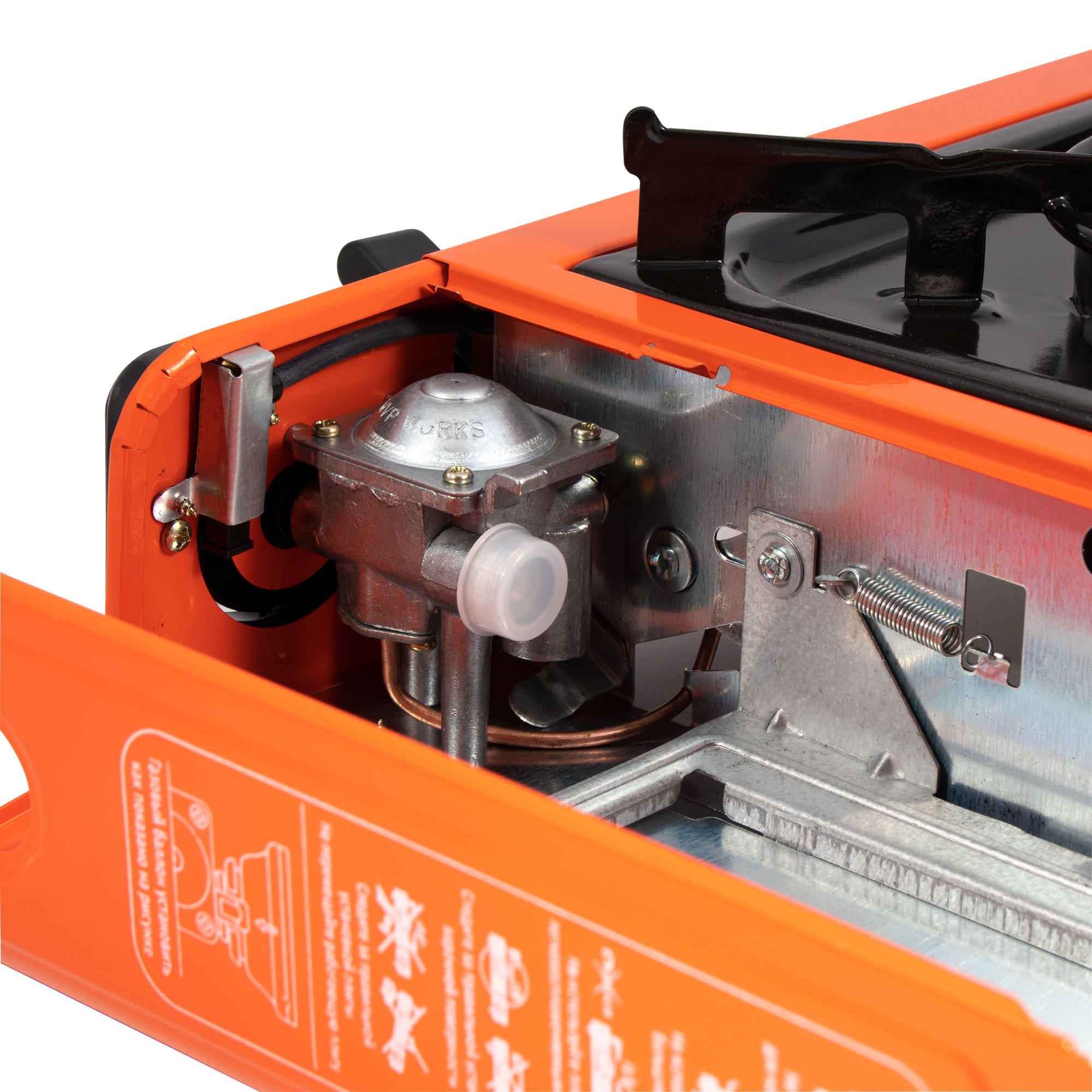 Плита оснащена одной горелкой с кольцевым пламенем, пьезоэлектрическим розжигом и блоком управления подачи газа. В качестве топлива используются газовые баллоны с нажимным клапаном и цанговым захватом.