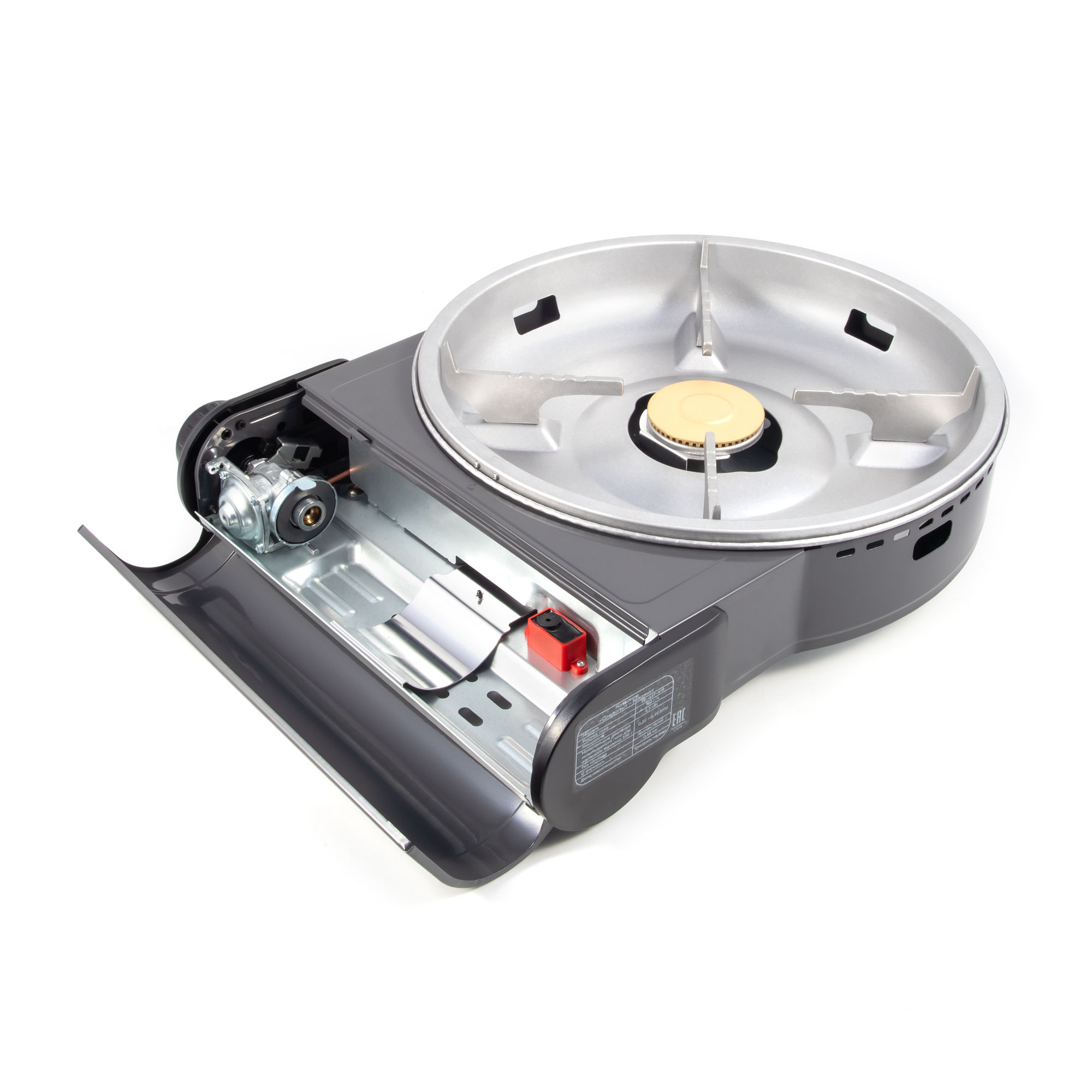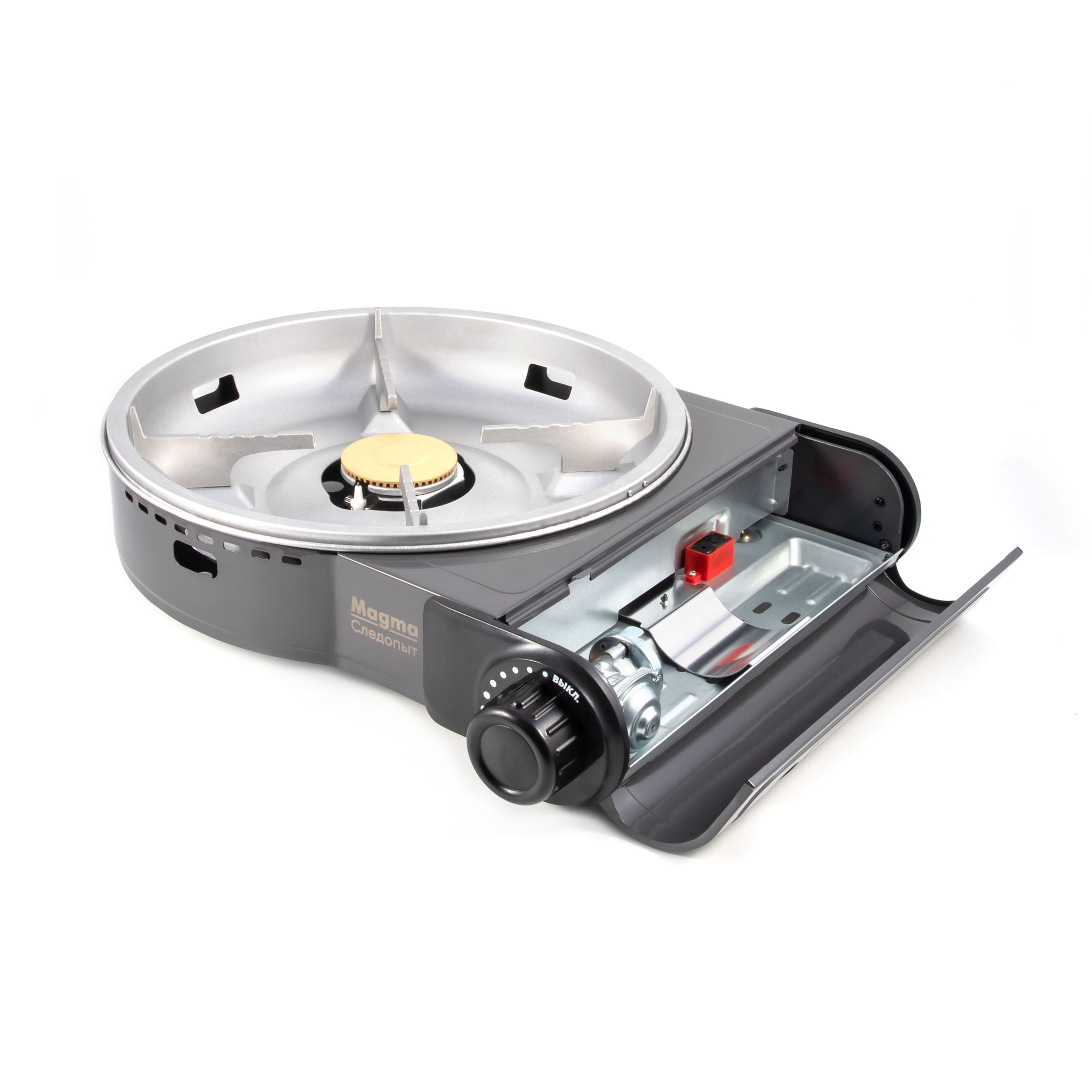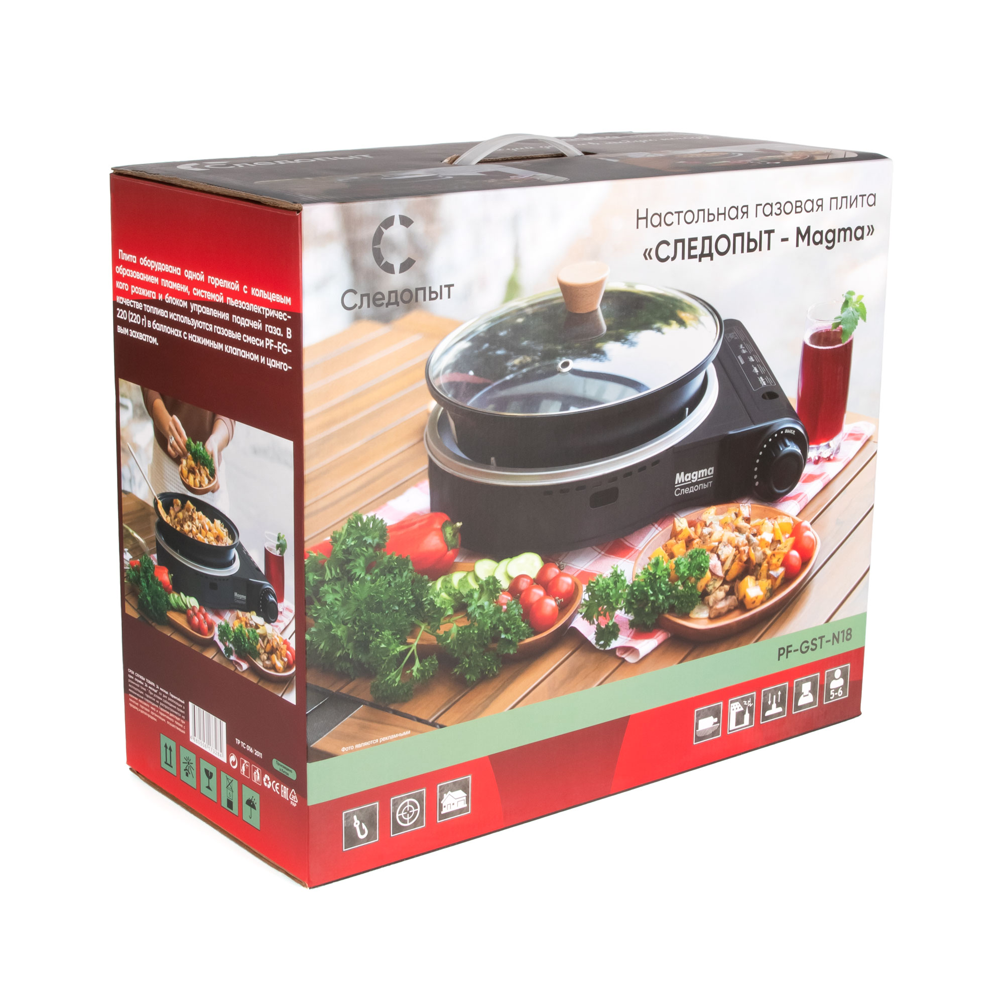 Плита настольная газовая «Следопыт-Magma» со сковородой и крышкой предназначена для приготовления пищи как в домашних условиях, так и открытом воздухе. Подходит для установки на открытых верандах, террасах и беседках. Может использоваться во время туристических походов, кемпинга, охоты и рыбалки. Плита оборудована одной горелкой с кольцевым образованием пламени, системой пьезоэлектрического розжига и блоком управления подачей газа. В качестве топлива используются газовые смеси PF-FG-220 (220 г) в баллонах с нажимным клапаном и цанговым захватом. Максимальный диаметр посуды 26 см. Характеристики: Габаритные размеры со сковородой: 405 х 335 х 200 мм; Масса: плита - 2000 г; сковорода - 720 г; крышка - 830 г; Мощность горелки: 2,3 кВт; Потребление газа: 168 г/час; Тип розжига: пьезо-электро; Тип топлива: пропан/бутан; Диаметр форсунки: 0,48 мм; Номинальное давление используемого газа для цангового баллона 220 г: 0,25-0,69 МПа. Фиксатор баллона к редуктору: магнитный кольцевой захват.