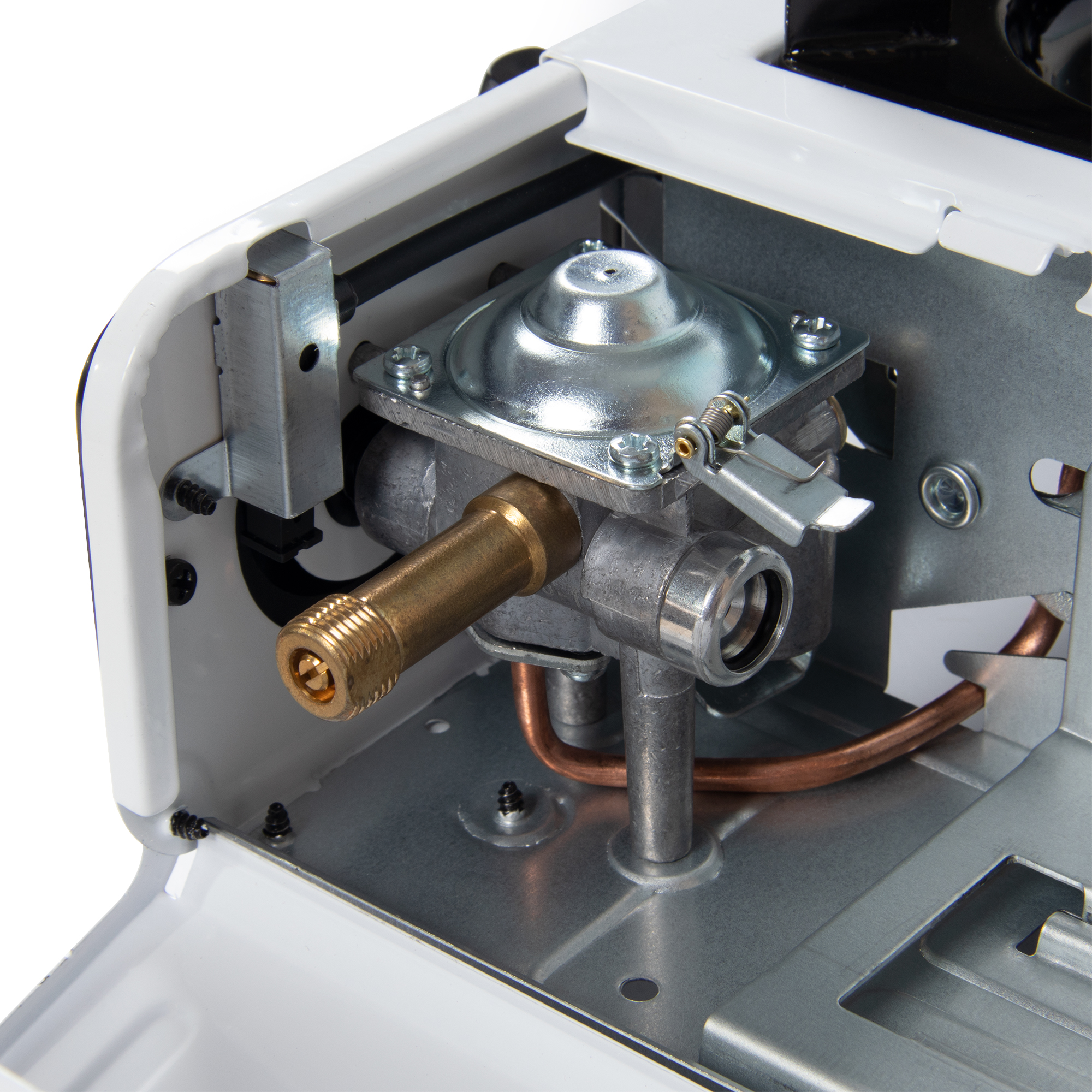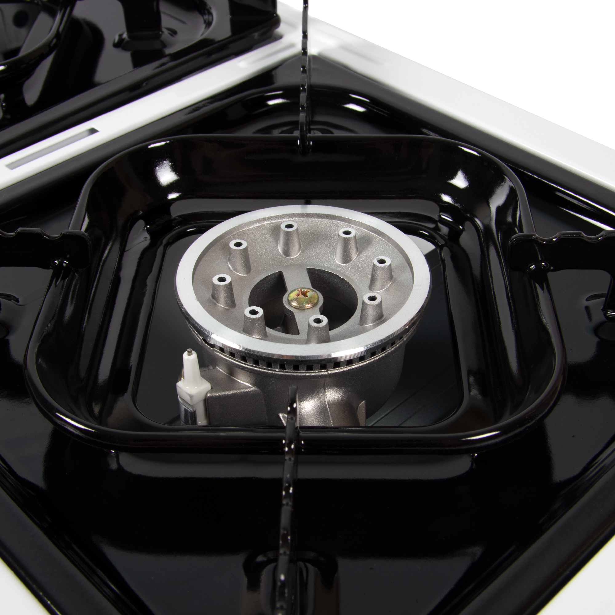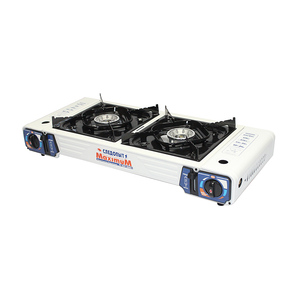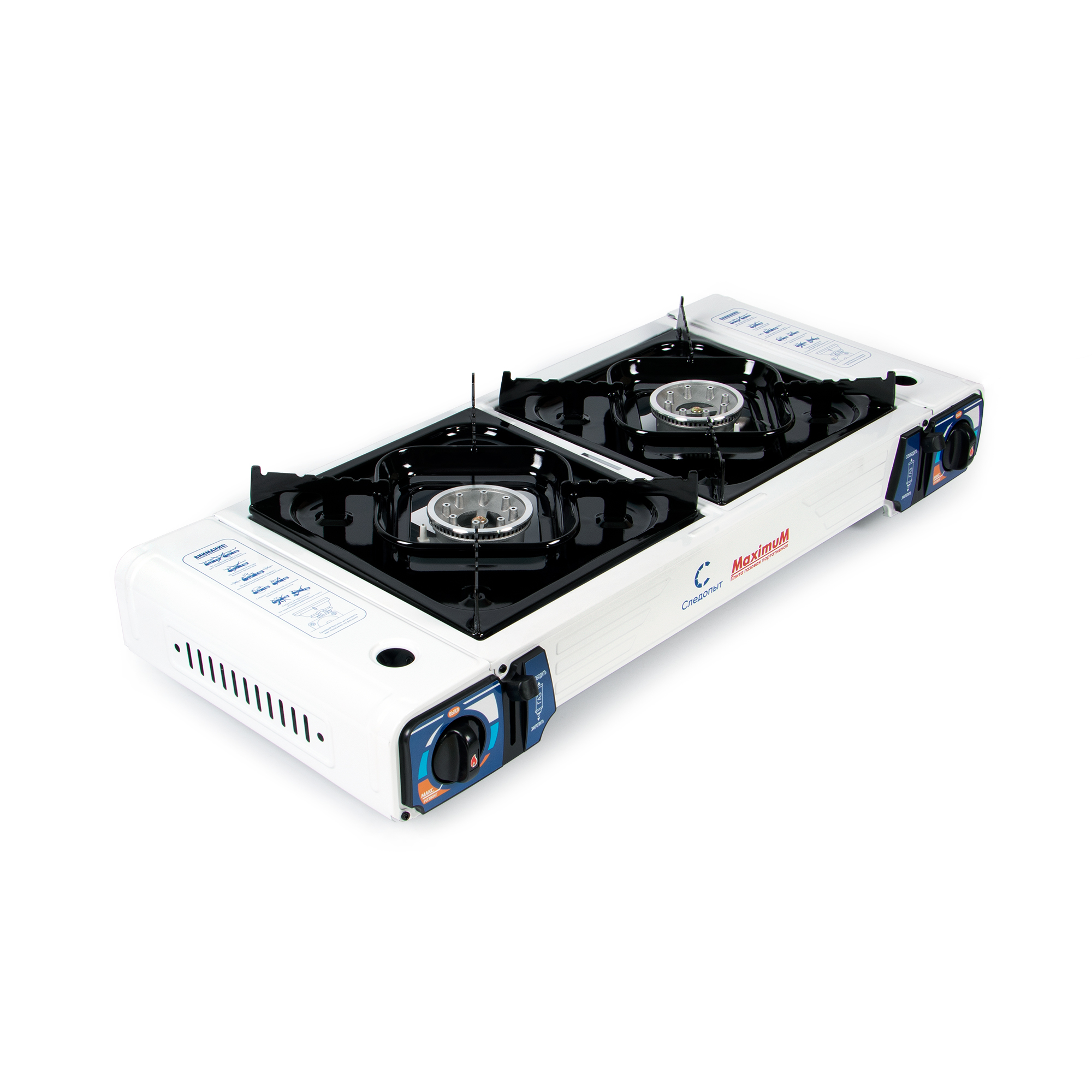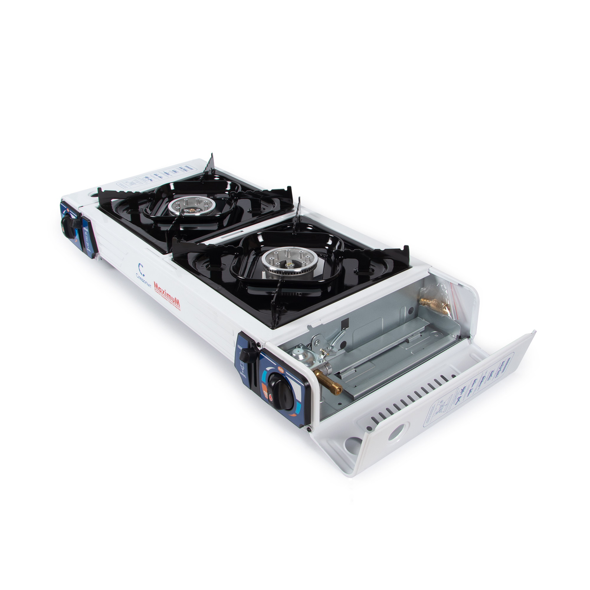 Плита настольная газовая «Следопыт Maximum» предназначена для приготовления пищи как в домашних условиях, так и открытом воздухе. Плита оборудована двумя горелками с кольцевым образованием пламени, имеет пьезоэлектрический розжиг и блок управления подачи газа. В качестве топлива используются газовые смеси в баллонах с нажимным клапаном и цанговым захватом, а также бытовой редукторный баллон через переходник. Подходит для установки на открытых верандах, террасах и беседках. Может использоваться во время туристических походов, кемпинга, охоты и рыбалки. ХАРАКТЕРИСТИКИ: • Вес – 2,4 кг • Мощность – 2,2 / 2 кВт • Расход топлива – 155 гр/ч (для одной горелки) • Размеры – 635*290*105 мм • Пьезо-розжиг – есть