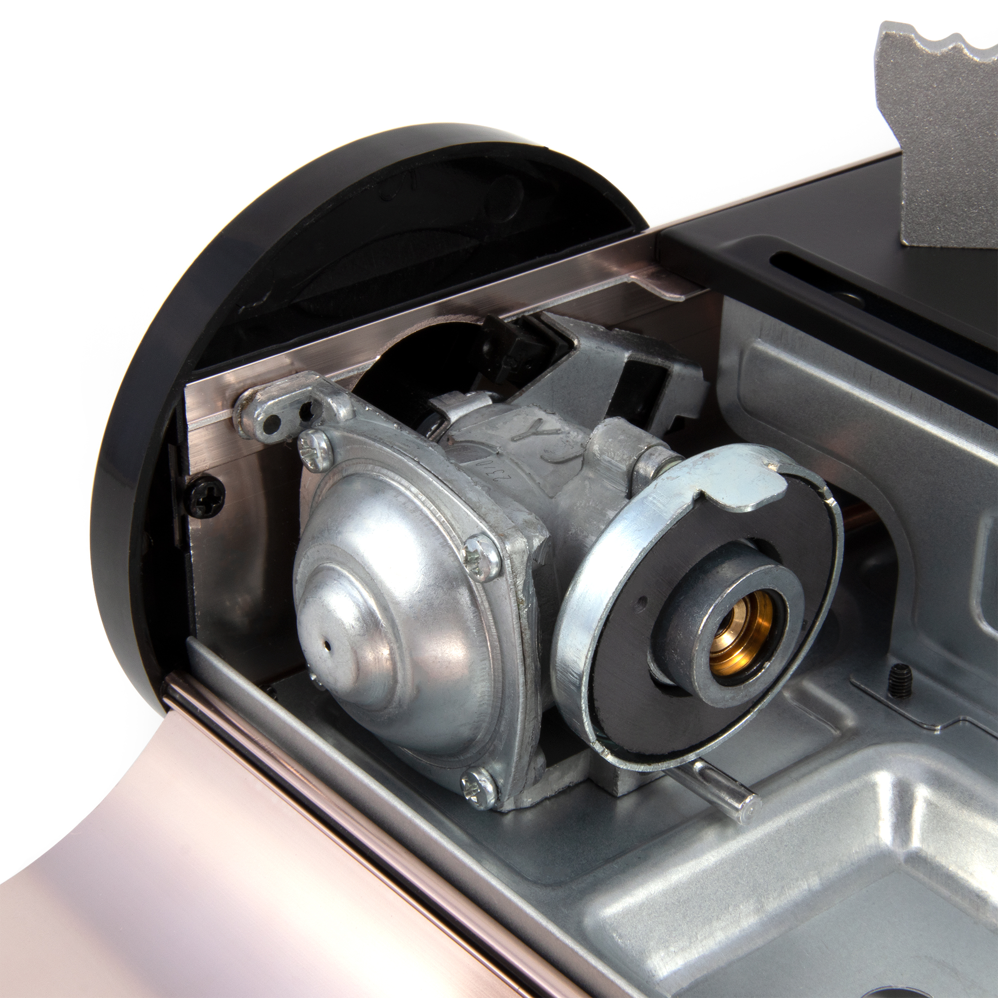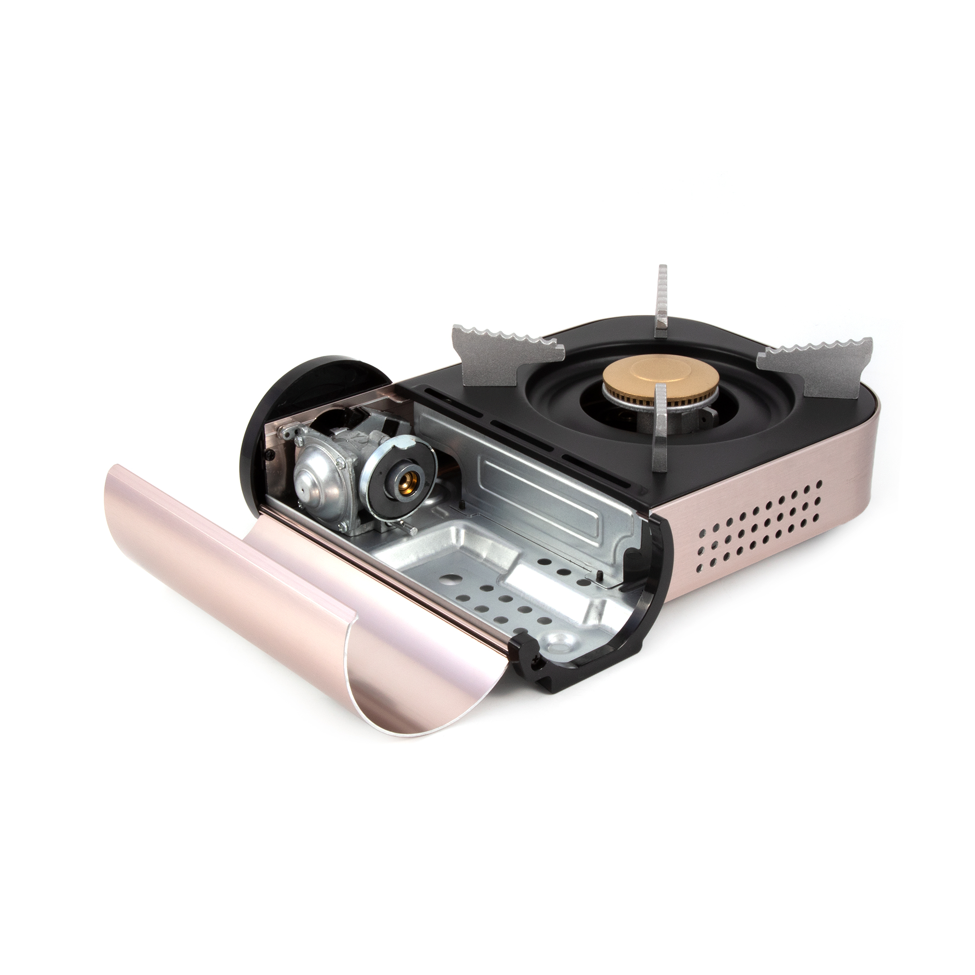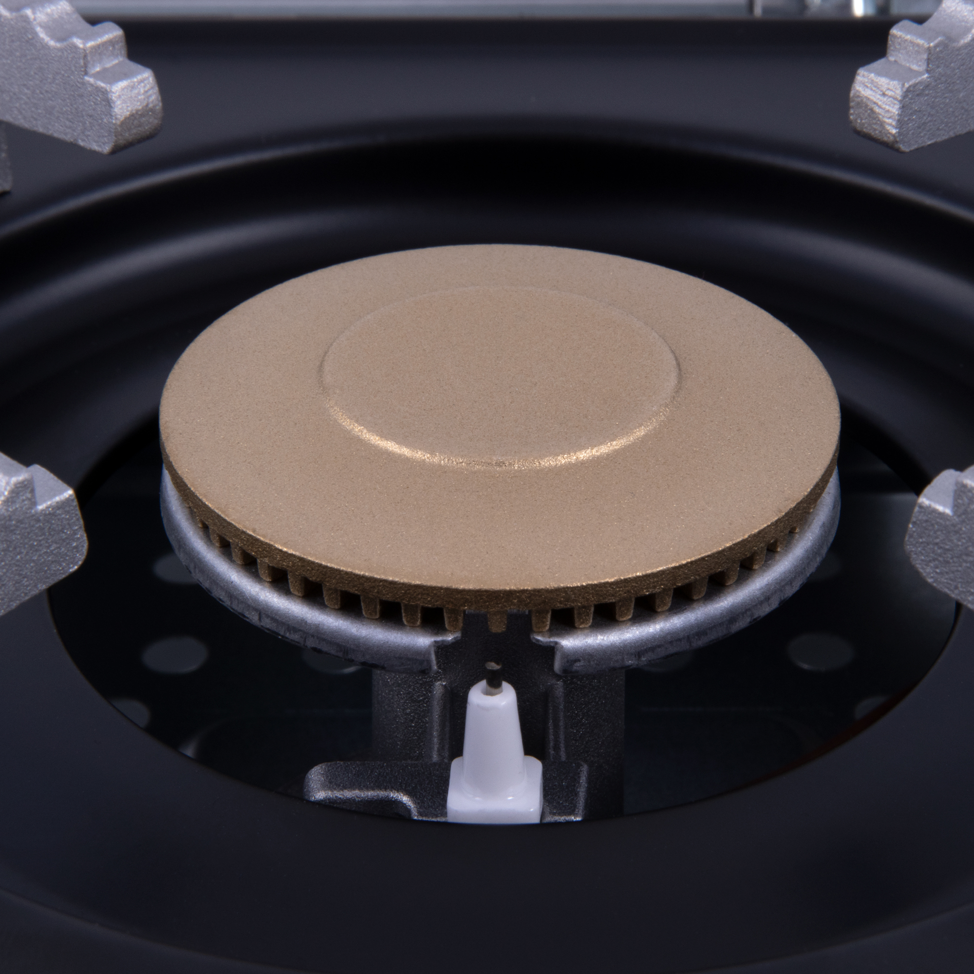 Оснащена одной горелкой с кольцевым пламенем, пьезоэлектрическим розжигом, блоком управления подачей газа и системой контроля избыточного давления. Для подключения баллона используется магнитный кольцевой захват, обеспечивающий быструю и надёжную фиксацию. Отверстие редуктора закрыто защитным пластиковым колпачком.