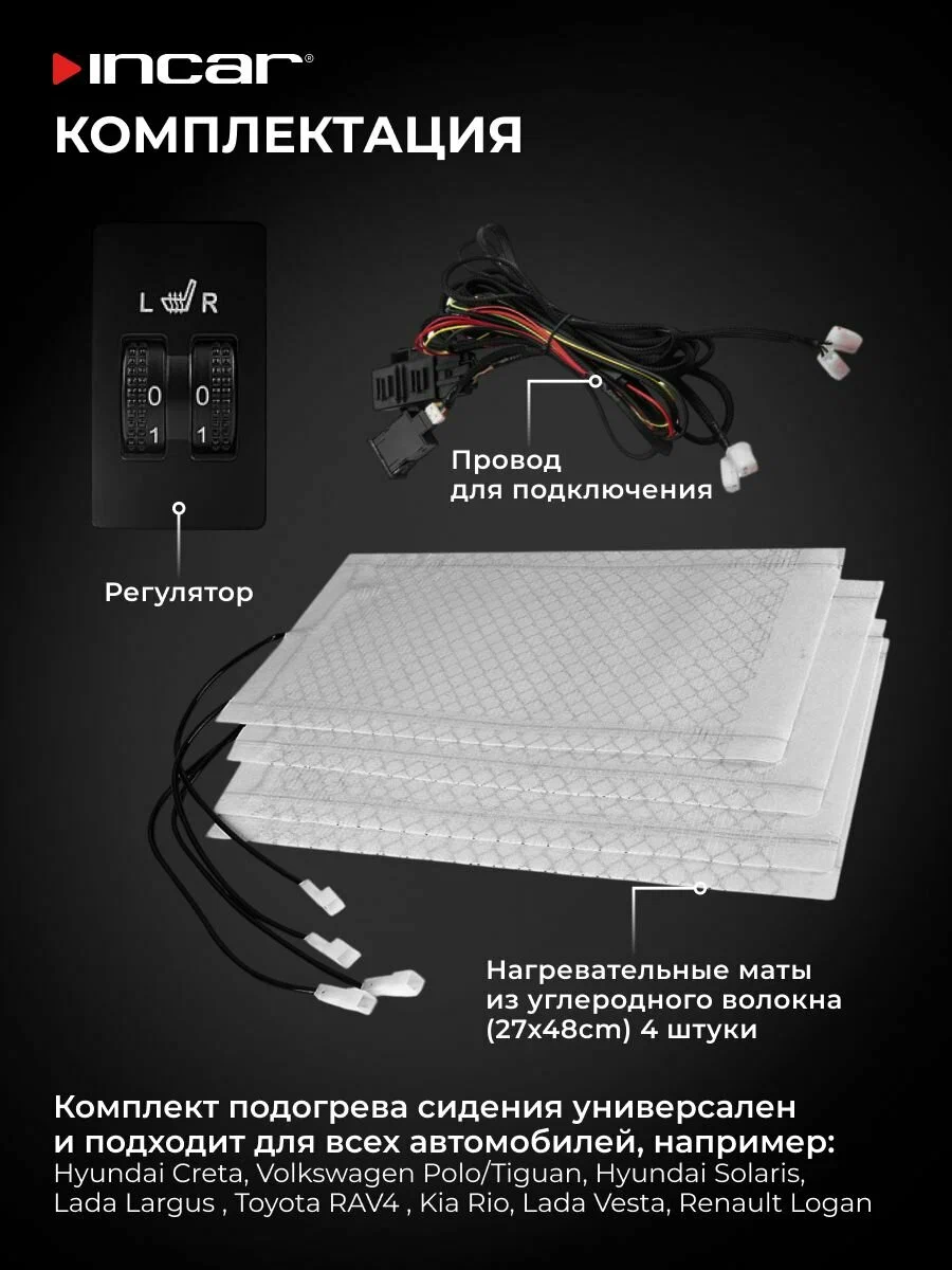 Подогрев сидений Incar SH-101 — это комплект для установки на два автомобильных сиденья с пятипозиционным регулятором температуры. Устройство предназначено для обогрева в холодное время года, обеспечивает быстрый нагрев и регулировку интенсивности.