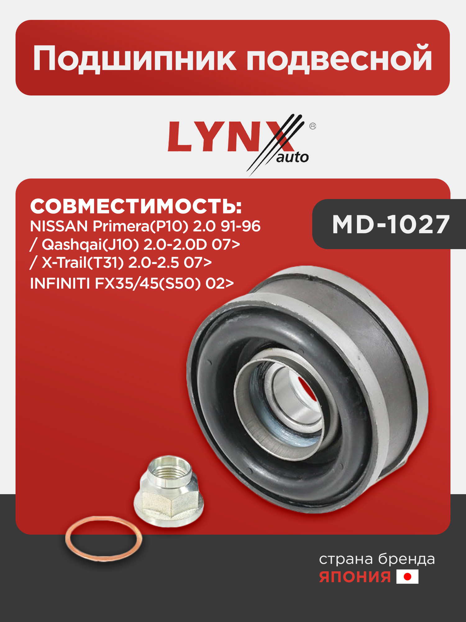 Подшипник подвесной LYNXauto MD-1027. Для: Nissan, Ниссан, Primera(Примера)(P10) 2.0 91-96 / Qashqai(Кашкай)(J10) 2.0-2.0D 07> / X-Trail(Икс-Траил)(T31) 2.0-2.5 07>, Infiniti, Инфинити, FX35/45(S50).