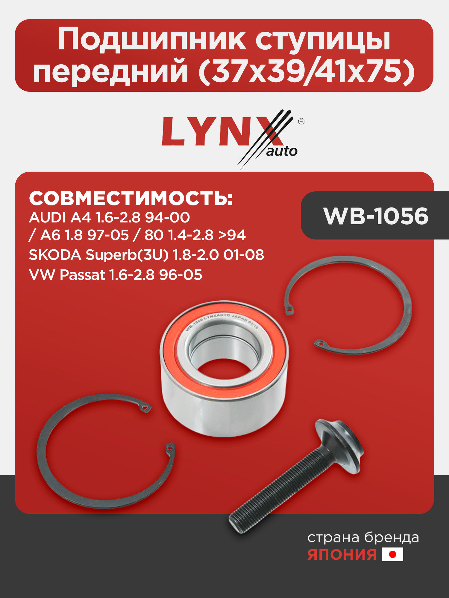 Подшипник ступицы передний (37x39/41x75) LYNXauto WB-1056. Для: Audi, Ауди A4 1.6-2.8 94-00 / A6 1.8 97-05 / 80 1.4-2.8 >94, Skoda, Шкода, Superb(Суперб)(3U) 1.8-2.0, VW, Фольксваген, Passat(Пассат)