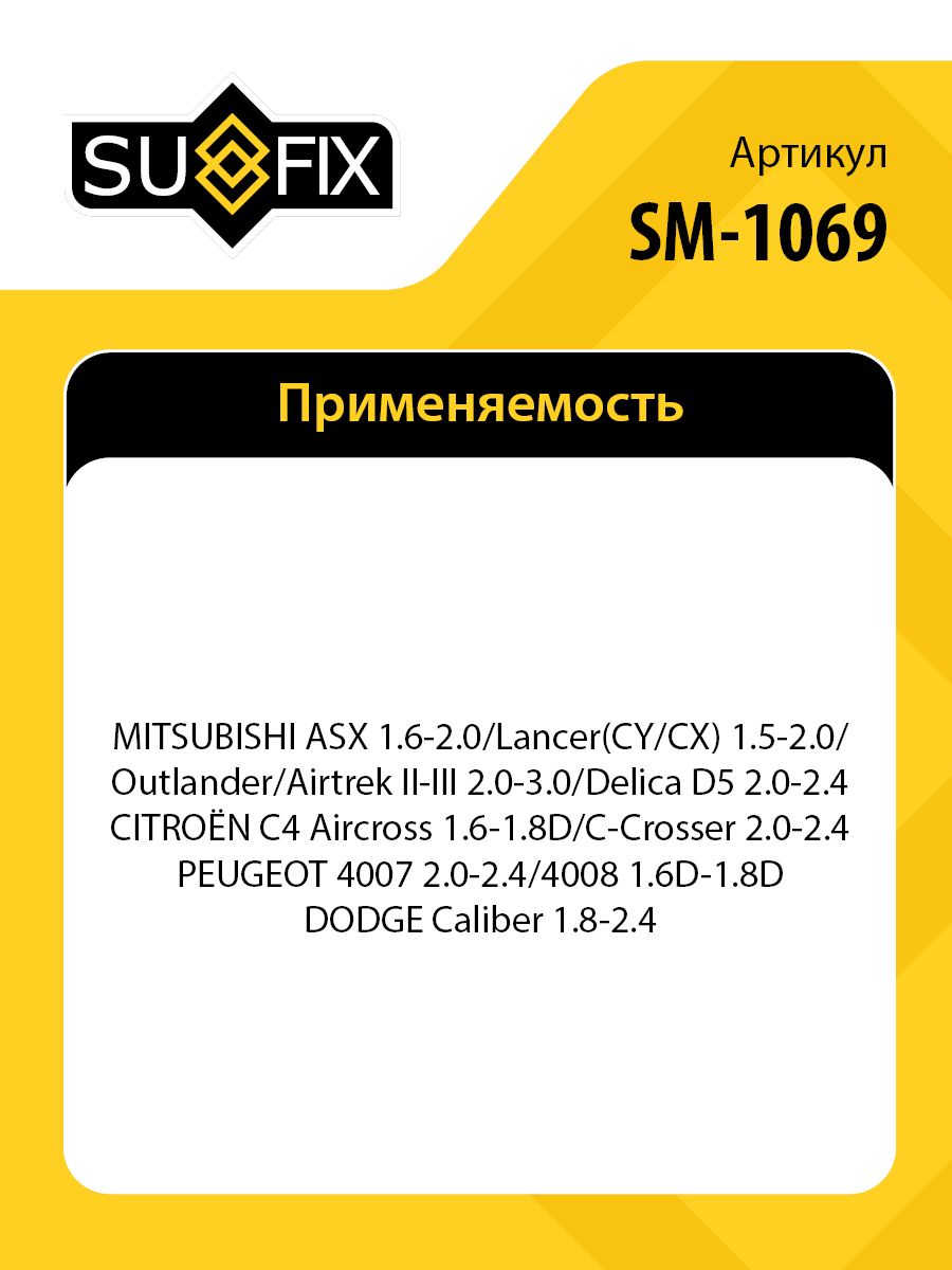 Подшипник ступицы передний (с ABS, 40x43x80) SUFIX SM-1069. Применение: MITSUBISHI ASX 1.6-2.0 10> / Lancer(CY/CX) 1.5-2.0 08> / Outlander/Airtrek II-III 2.0-3.0 06> / Delica D5 2.0-2.4 07>, CITROEN C4 Aircross 1.6-1.8D 12> / C-Crosser 2.0-2.4 07>, PEUGEOT 4007 2.0-2.4 07> / 4008 1.6D-1.8D 12>, DODGE Caliber 1.8-2.4 06>.