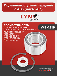 Подшипник ступицы передний с ABS (44x45x83) LYNXauto WB-1219. Для: CITROEN Ситроен C4 II 1.2-2.0D 09> / C5 III 1.6D-3.0 08> / C6 2.2D-3.0 06>, PEUGEOT Пежо 3008 2.0D 11> / 308 1.6 10> / 407 1.6D-3.0 04> / 508 1.6D-2.2D 10> / 607 2.0-3.0 00>