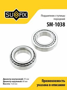 Подшипник ступицы передний SUFIX SM-1038. Применение: CHEVROLET Matiz 0.8-1.0 05> / Spark 0.8-1.0 05>, DAEWOO Matiz 0.8-1.0 98>.