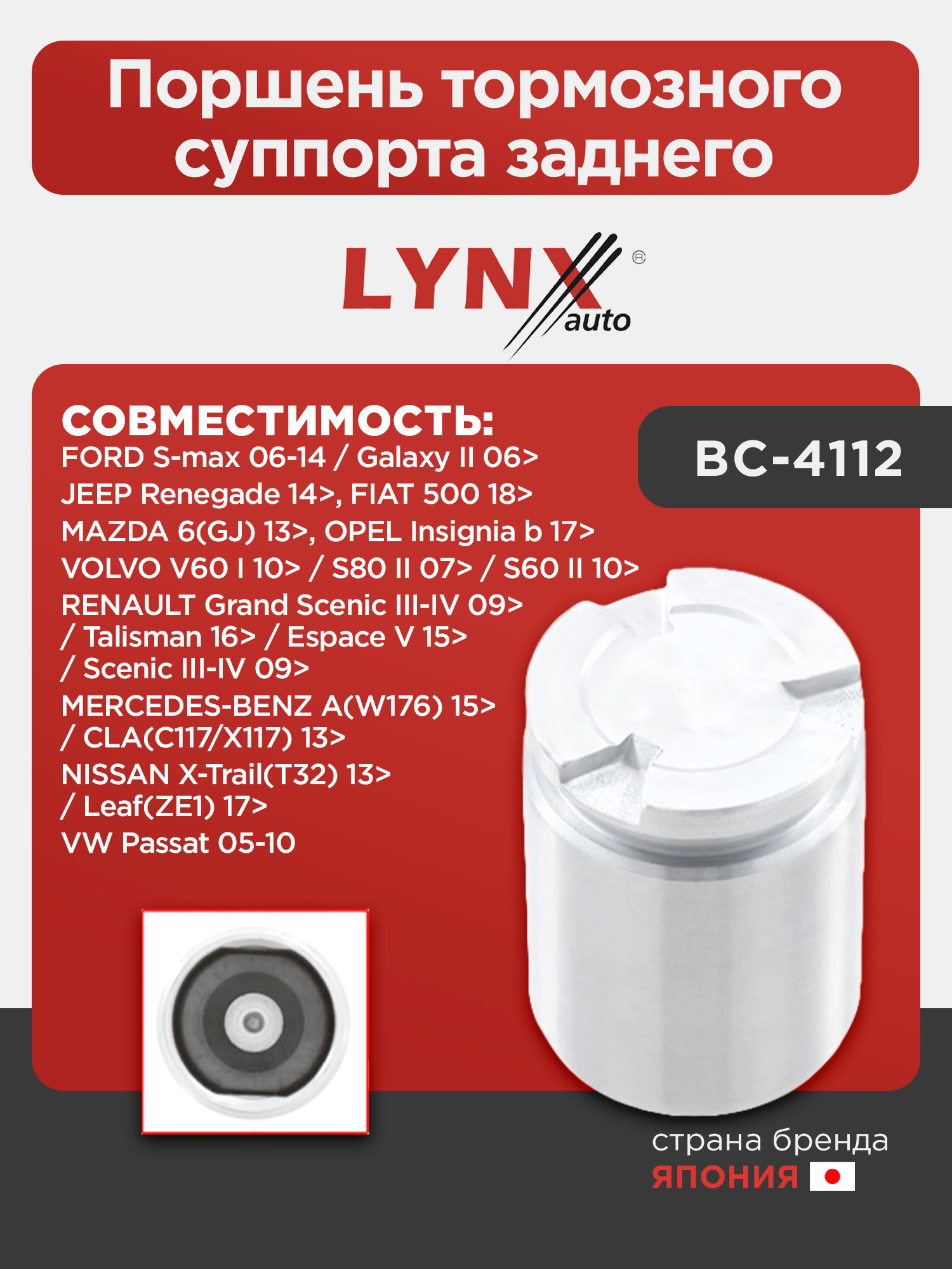 Поршень тормозного суппорта заднего LYNXauto BC-4112. Для: FIAT ФИАТ 500 18>, FORD ФОРД S-max(Смакс) 06-14 / Galaxy(Гэлакси) II 06>, JEEP Renegade 14>, MAZDA(Мазда) 6(GJ) 13>, MERCEDES Мерседес-BENZ CLA(C117/X117) 13> / A(W176) 15>, NISSAN НИССАН X-Trail(