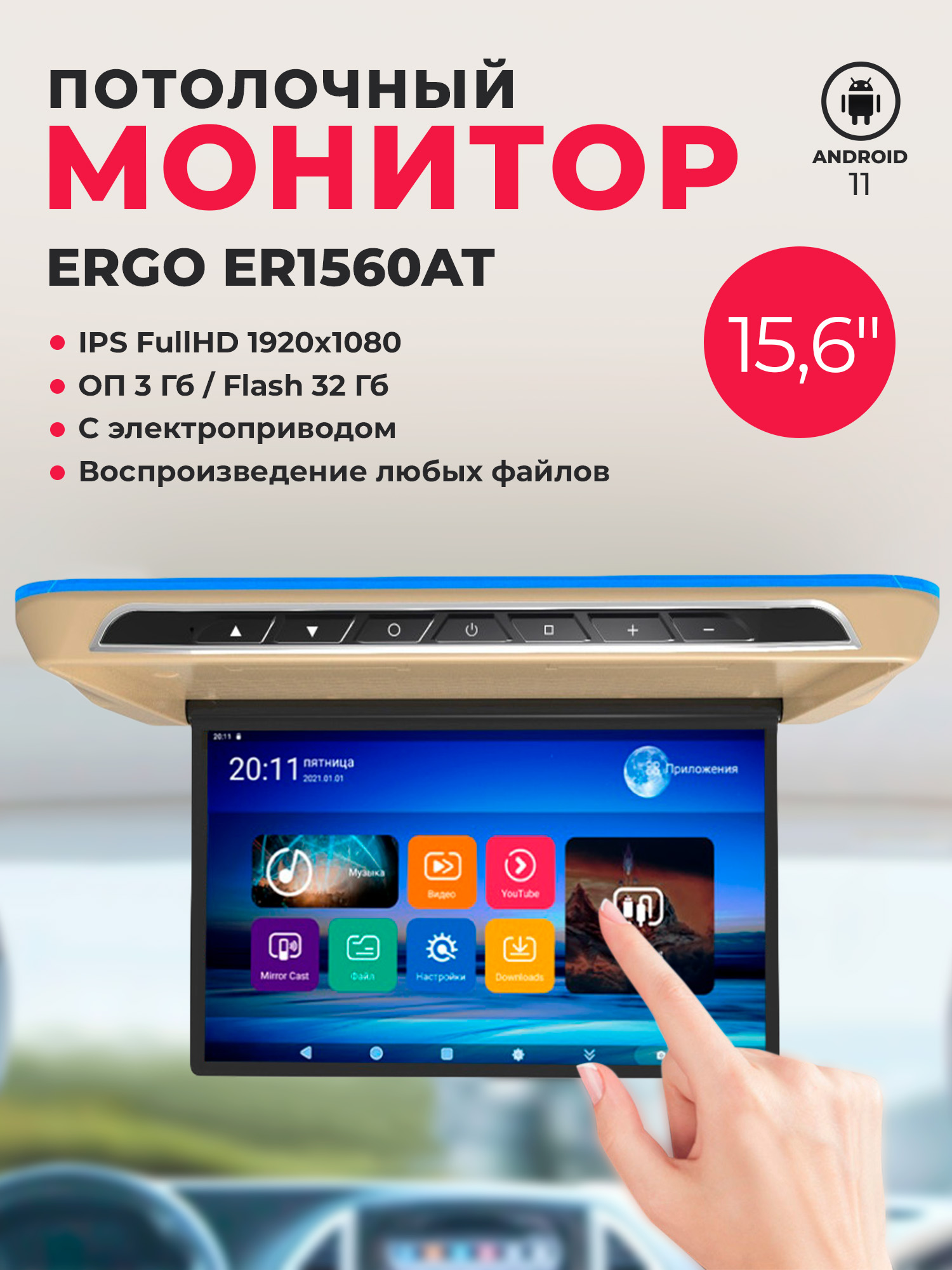 Воспроизведение любых файлов - Потолочный монитор ER1560AT поддерживает все аудио и видео кодеки. Больше не надо задумываться о том, прочитает ли монитор звуковую дорожку AC3. Не нужно сидеть и конвертировать файлы, чтобы в дороге не возникало проблем со звуком и видео. Скачали, включили и наслаждаетесь любимыми фильмами, передачами, мультфильмами. Wi-Fi и YouTube - В потолочном мониторе есть встроенный модуль Wi-Fi! Раздав интернет с телефона, или подключив монитор к мобильному роутеру, вы и ваши попутчики всю дорогу можете коротать время за, уже привычном и удобном для нас, YouTube или же можно сразу из меню перейти в онлайн кинотеатр Кинопоиск.