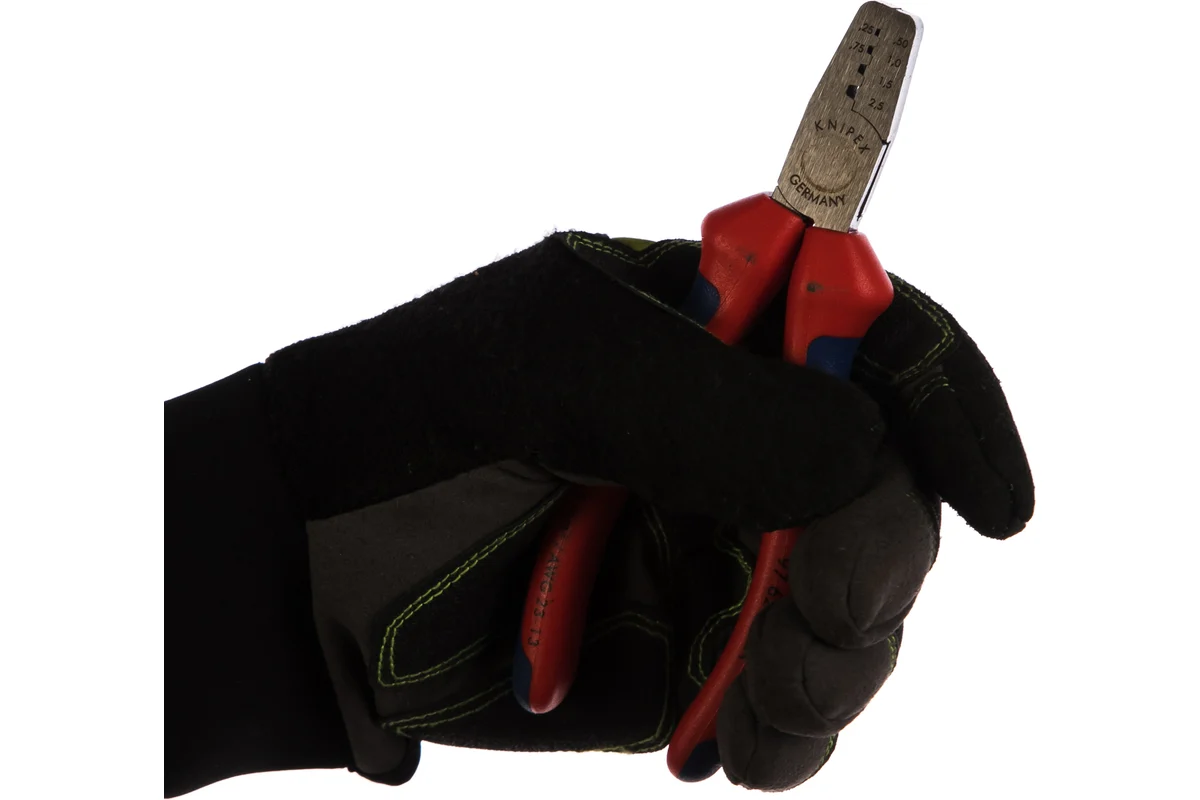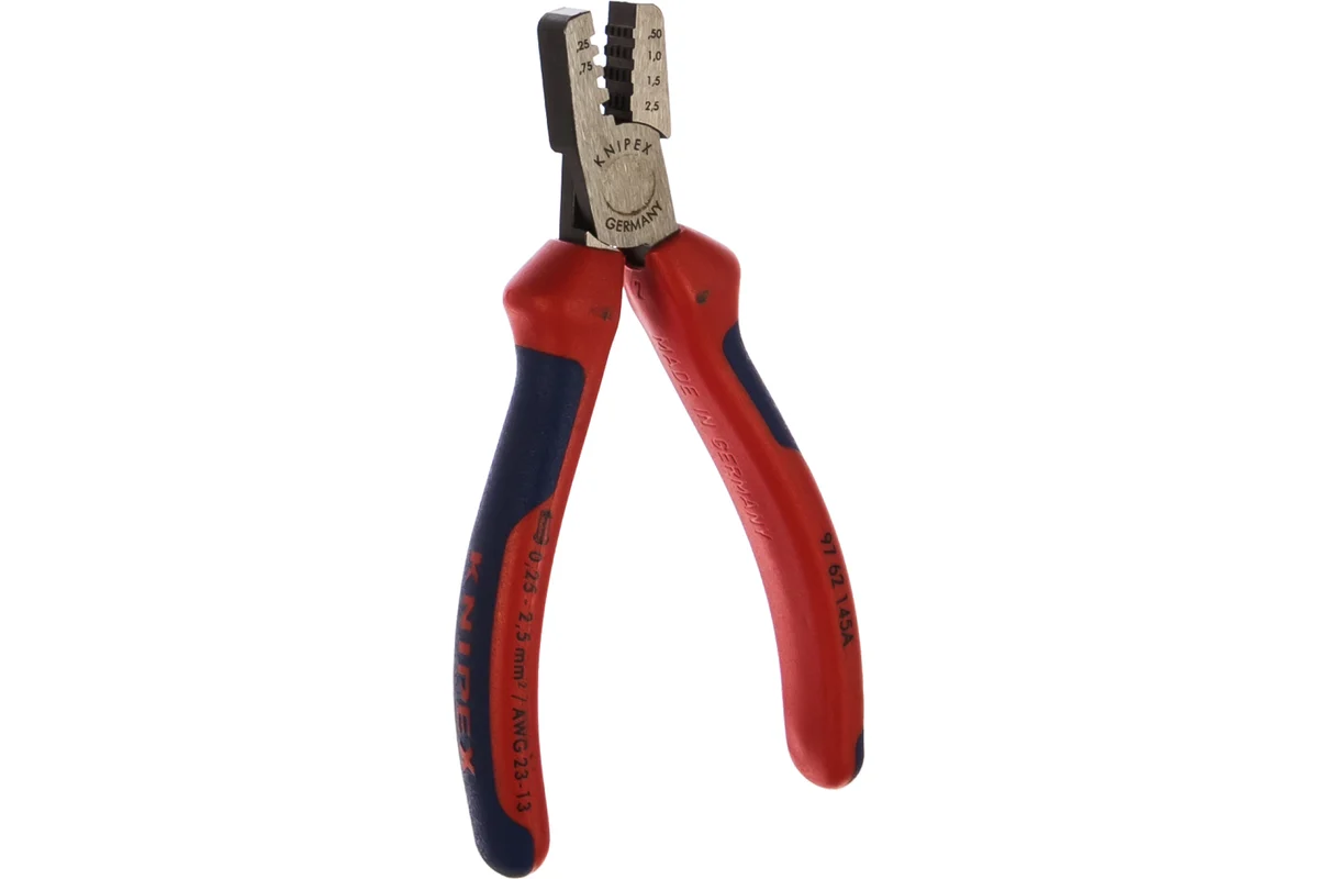 Ручной обжимник KNIPEX KN-9762145A используется для опрессовки контактных гильз в диапазоне от 0.25 до 2.5 кв. мм. Имеет прочную конструкцию, так как изготовлен из кованой ванадиевой электростали. Полированная головка защищена от коррозии, что увеличивает срок эксплуатации инструмента. На рукоятках двухкомпонентные чехлы предназначены для обеспечения комфорта и исключения проскальзывания.