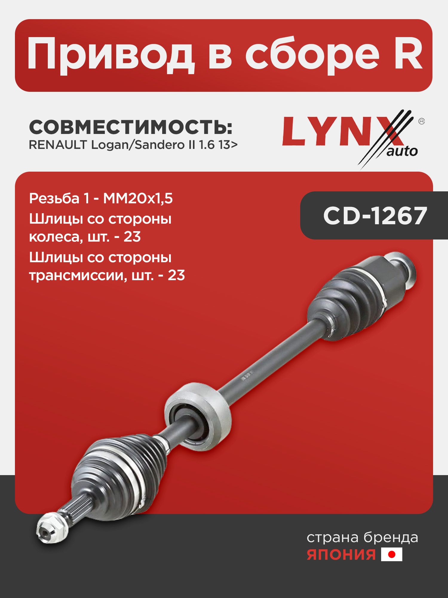 Привод в сборе R LYNXauto CD-1267. Применение: RENAULT Logan/Sandero II 1.6 13>. Резьба 1 - MM20x1,5. Шлицы со стороны колеса, шт. - 23. Шлицы со стороны трансмиссии, шт. - 23.