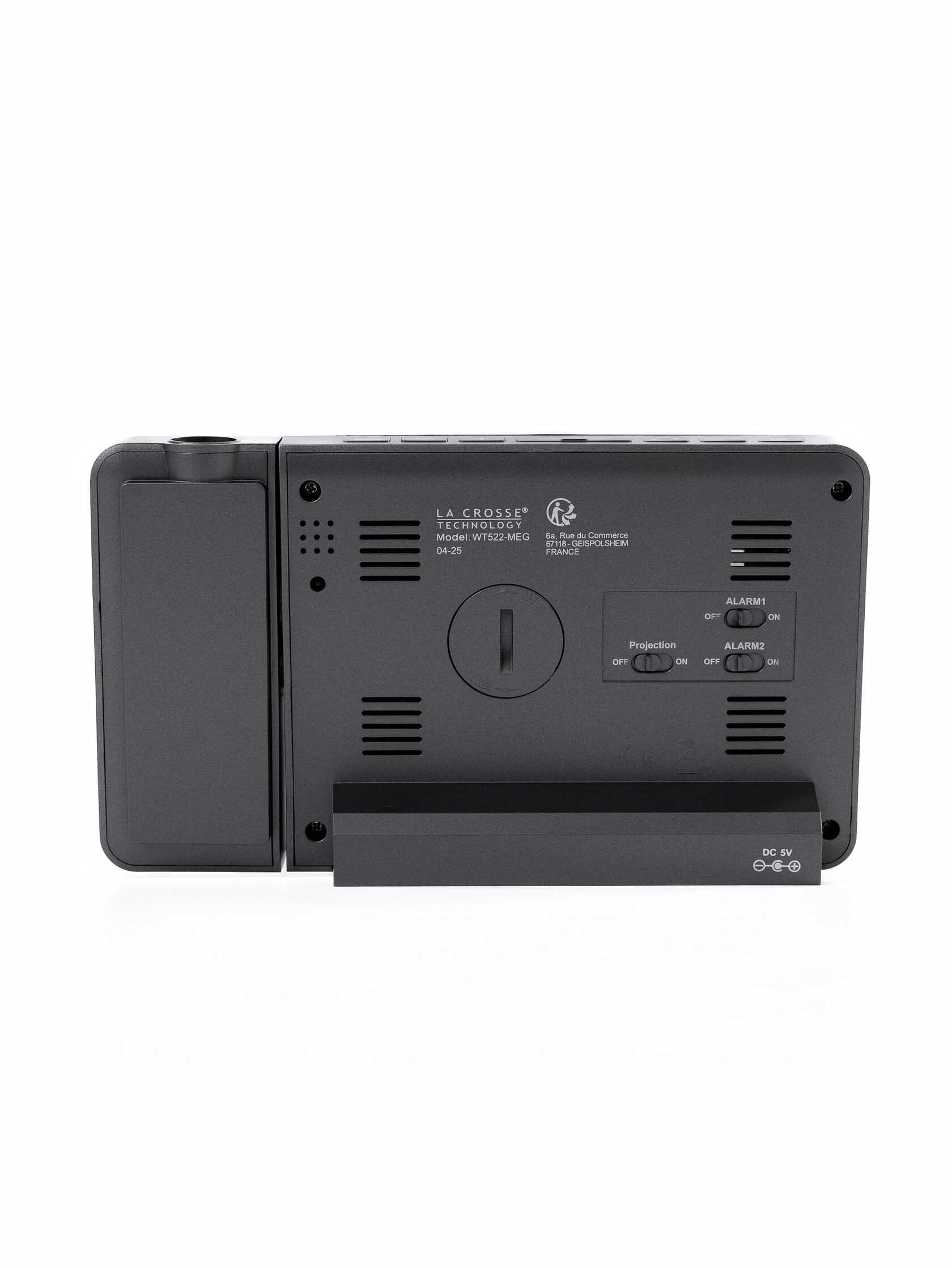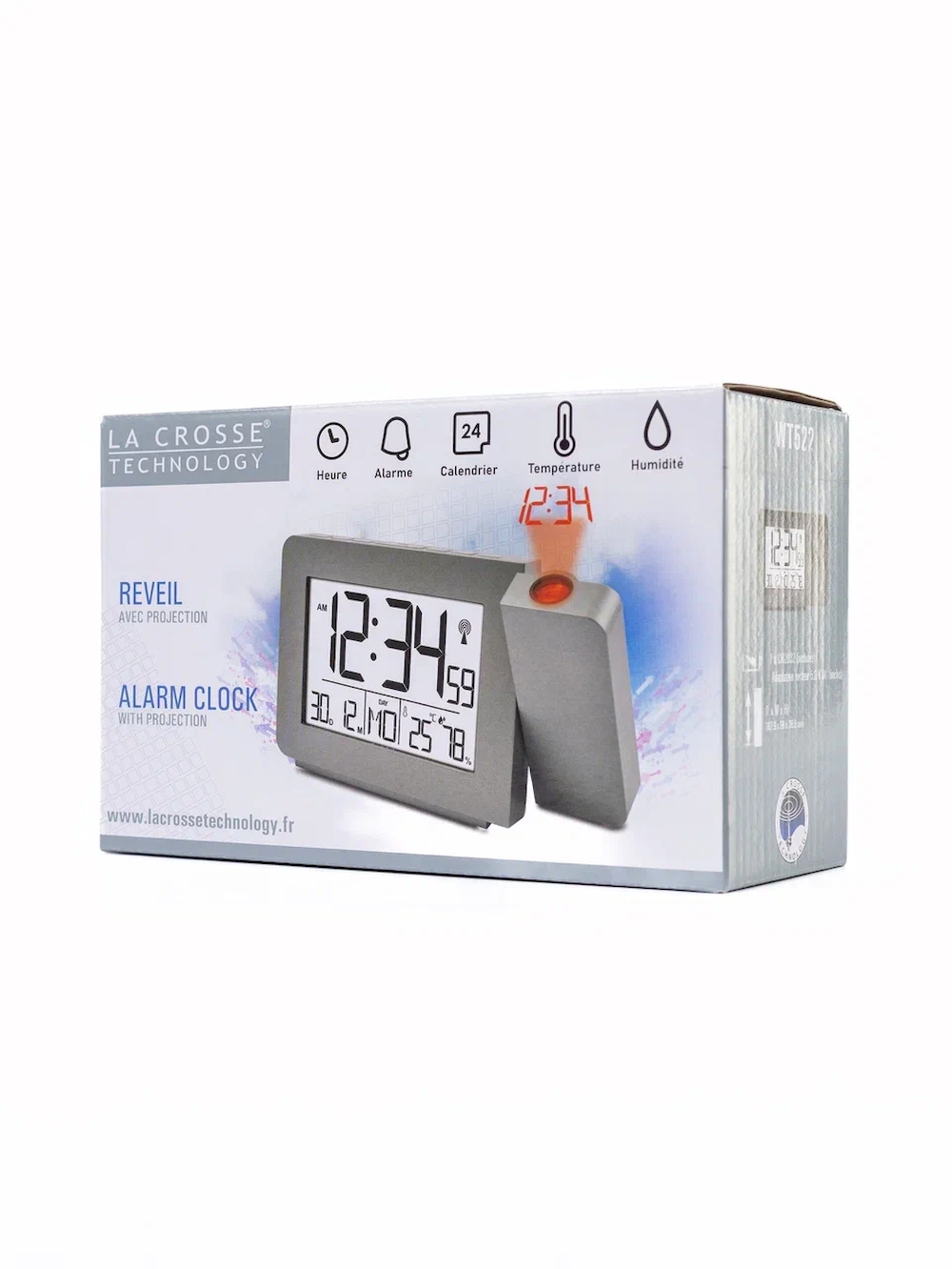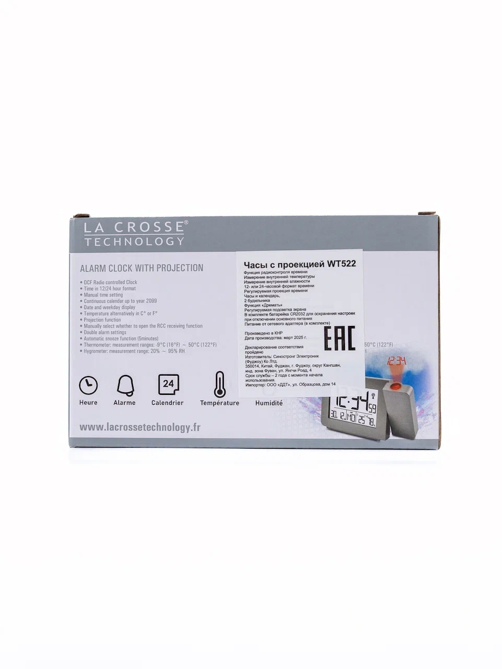Проекционные часы с термогигрометром LaCrosse WT522 - это технологичный прибор для измерения температуры и влажности в комнате. Основную часть дисплея занимают часы, но пользователю доступен также календарь и данные о температуре и влажности. Кроме того, устройство оснащено настраиваемым проектором, позволяющим отображать время в темное время суток на любой поверхности. Часы имеют возможность синхронизации времени по радиосигналам (работа функции не гарантируется и зависит от местоположения устройства) и два встроенных будильника. Дисплей LaCrosse WT522 оснащен подсветкой, а входящий в комплект адаптер позволяет обеспечивать, при необходимости, режим постоянной работы проектора.