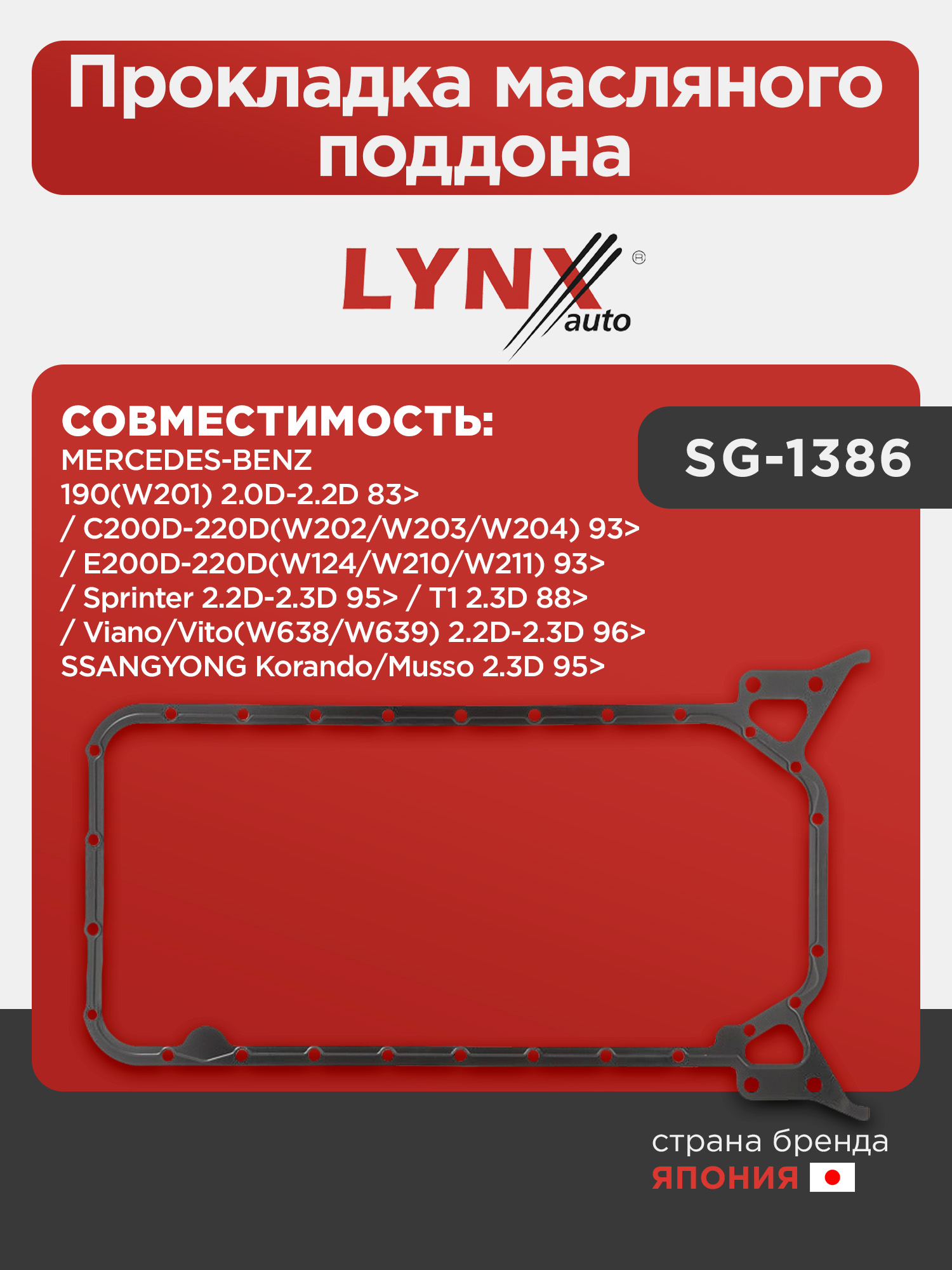 Прокладка масляного поддона LYNXauto SG-1386. Для: MERCEDES-BENZ 190(W201) 2.0D-2.2D 83> / C200D-220D(W202/W203/W204) 93> / E200D-220D(W124/W210/W211) 93> / Sprinter 2.2D-2.3D 95> / T1 2.3D 88> / Viano/Vito(W638/W639) 2.2D-2.3D 96>, SSANGYONG Korando/Musso 2.3D 95>