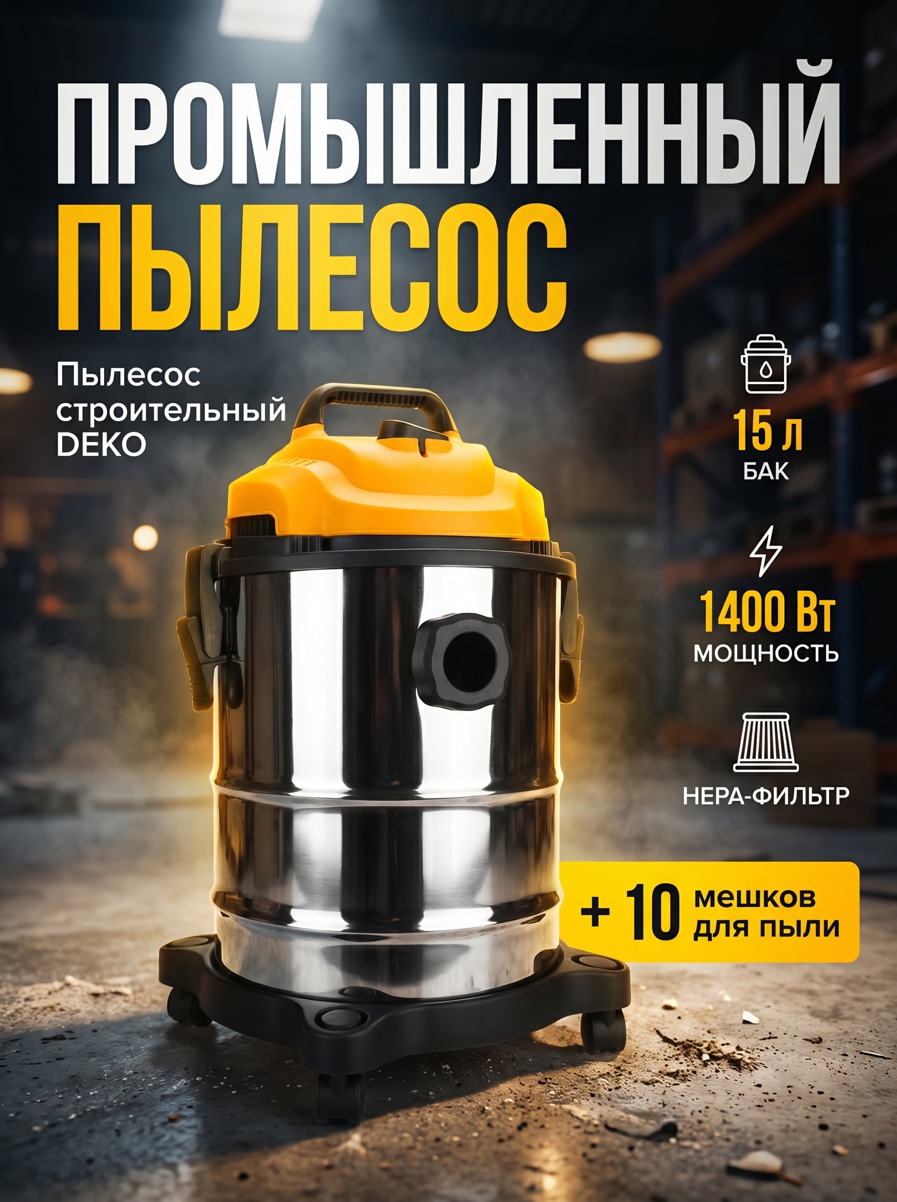 Пылесос промышленный DEKO DKVC-1400-15S, 10 мешков для пыли