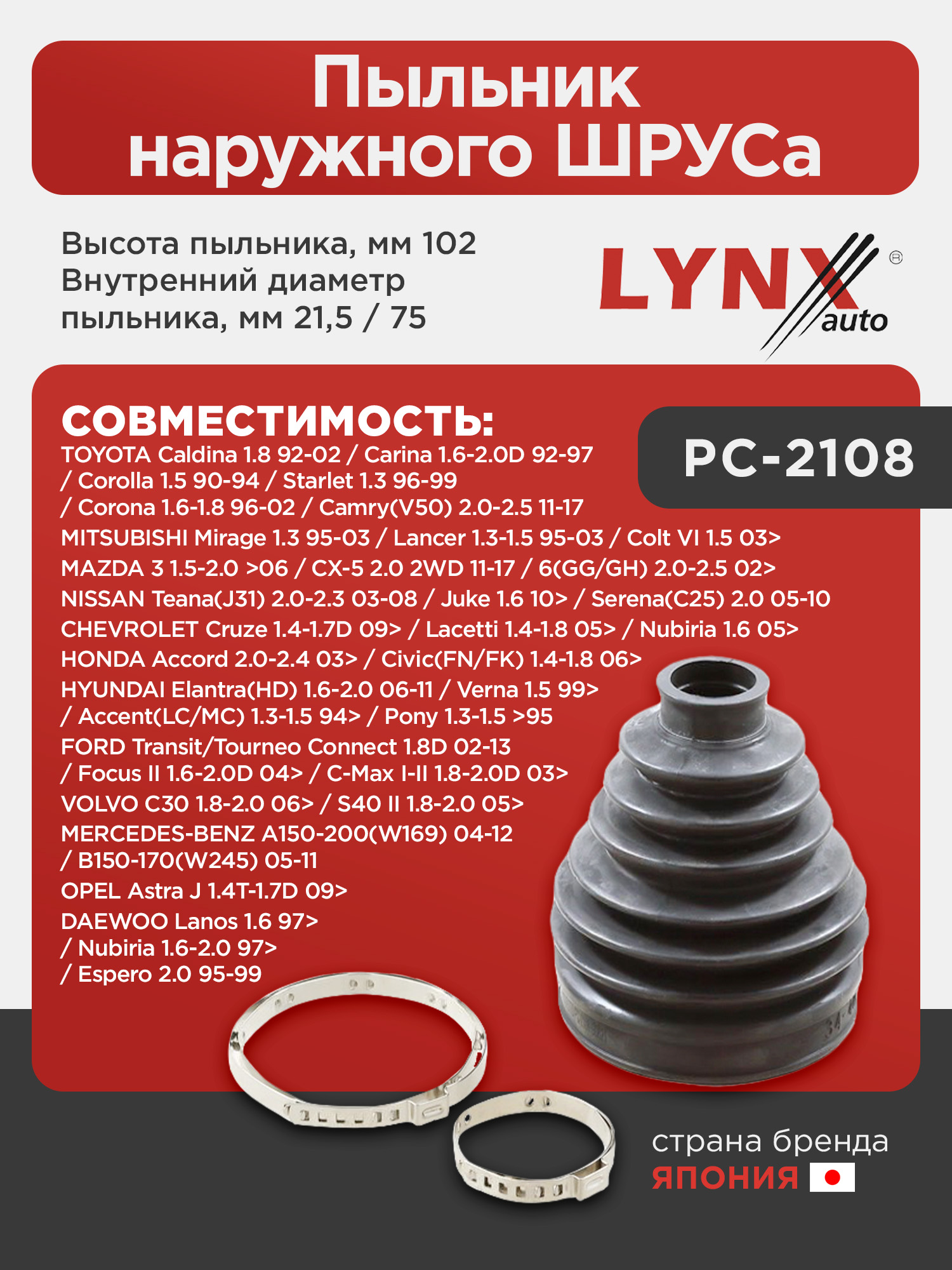 Пыльник наружного ШРУСа LYNXauto PC-2108. Характеристики: TOYOTA Caldina 1.8 92-02 / Carina 1.6-2.0D 92-97 / Corolla 1.5 90-94 / Starlet 1.3 96-99 / Corona 1.6-1.8 96-02 / Camry(V50) 2.0-2.5 11-17, MITSUBISHI Mirage 1.3 95-03 / Lancer 1.3-1.5 95-03 / Colt VI 1.5 03>, MAZDA 3 1.5-2.0 >06 / CX-5 2.0 2WD 11-17 / 6(GG/GH) 2.0-2.5 02>, NISSAN Teana(J31) 2.0-2.3 03-08 / Juke 1.6 10> / Serena(C25) 2.0 05-10, HYUNDAI Elantra(HD) 1.6-2.0 06-11 / Verna 1.5 99> / Accent(LC/MC) 1.3-1.5 94> / Pony 1.3-1.5 >95, OPEL Astra J 1.4T-1.7D 09>, CHEVROLET Cruze 1.4-1.7D 09> / Lacetti 1.4-1.8 05> / Nubiria 1.6 05>, MERCEDES-BENZ A150-200(W169) 04-12 / B150-170(W245) 05-11, FORD Transit/Tourneo Connect 1.8D 02-13 / Focus II 1.6-2.0D 04> / C-Max I-II 1.8-2.0D 03>, VOLVO C30 1.8-2.0 06> / S40 II 1.8-2.0 05>, HONDA Accord 2.0-2.4 03> / Civic(FN/FK) 1.4-1.8 06>, DAEWOO Lanos 1.6 97> / Nubiria 1.6-2.0 97> / Espero 2.0 95-99. Высота пыльника, мм 102.