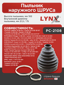 Пыльник наружного ШРУСа LYNXauto PC-2108. Характеристики: Toyota, Тойота, Caldina 1.8 92-02 / Carina(Карина) 1.6-2.0D 92-97 / Corolla(Корола) 1.5 90-94 / Starlet 1.3 96-99 / Corona 1.6-1.8 96-02.