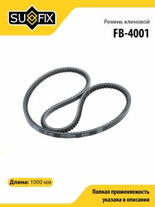 Ремень клиновой SUFIX FB-4001. Применение: BMW 3(E30)/5(E28/34) 2.4TD, CHRYSLER Voyager 3.0 95-01, FORD Sierra 2.0-2.8 >86, JAGUAR XJ 4.0 94-97,MERCEDES-BENZ 190 2.0(W201) >84, OPEL Frontera 2.0 92-98/Omega A 1.8-2.0/Vectra A 1.8-2.0 >90, TOYOTA Land Cruiser 80/100 4.2.