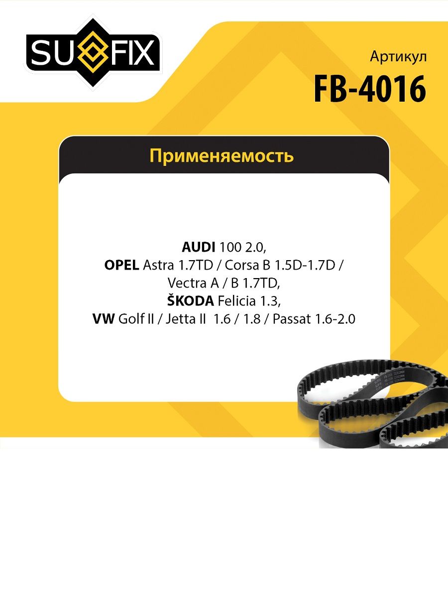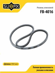 Ремень клиновой SUFIX FB-4016. Применение: AUDI 100 2.0 >94, OPEL Astra 1.7TD >98/Corsa B 1.5D-1.7D 93-00/Vectra A/B 1.7TD >98, SKODA Felicia 1.3 94-01, VW Golf II >92/Jetta II >91 1.6/1.8/Passat 1.6-2.0 >96.